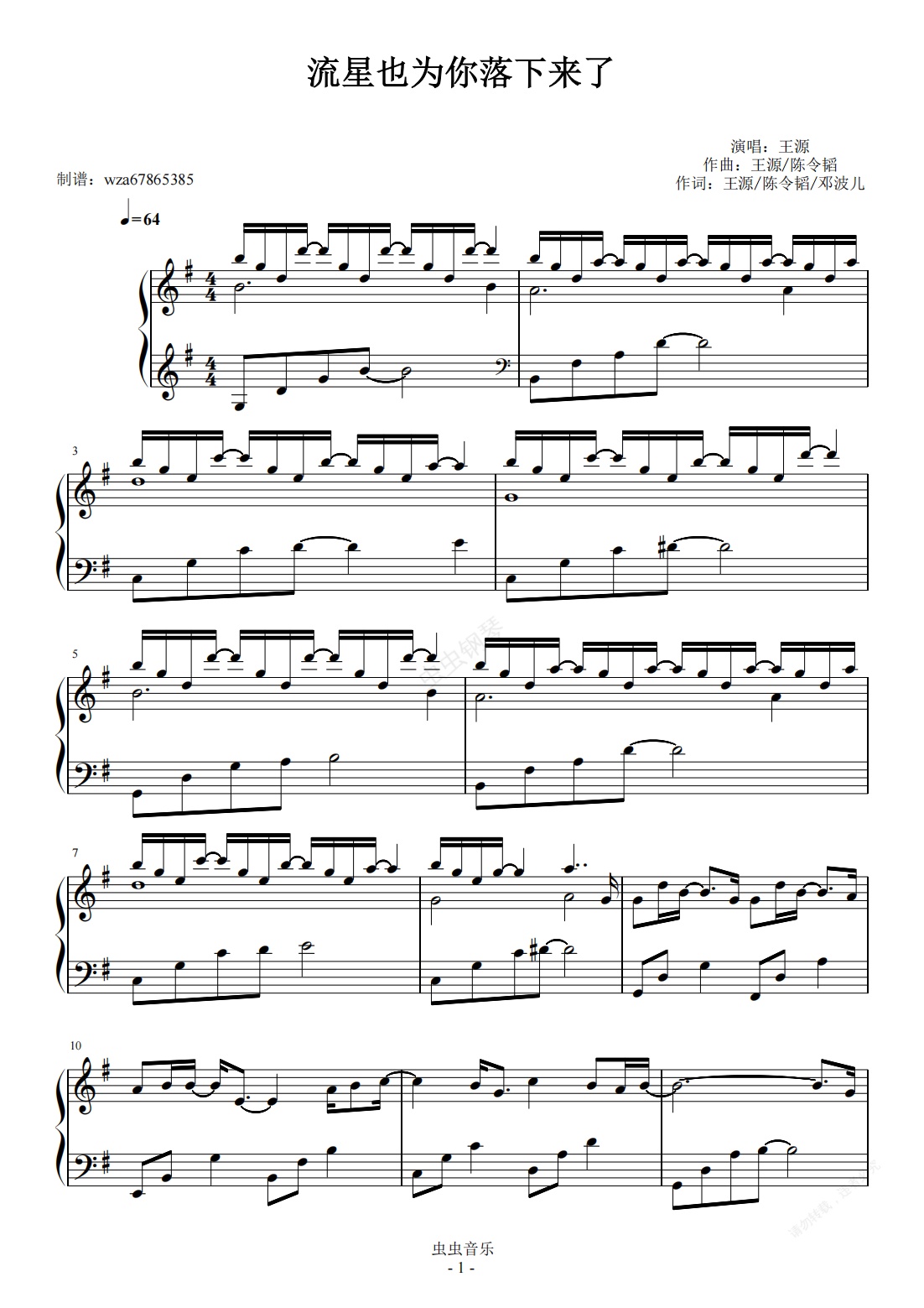 钢琴谱:流星也为你落下来了