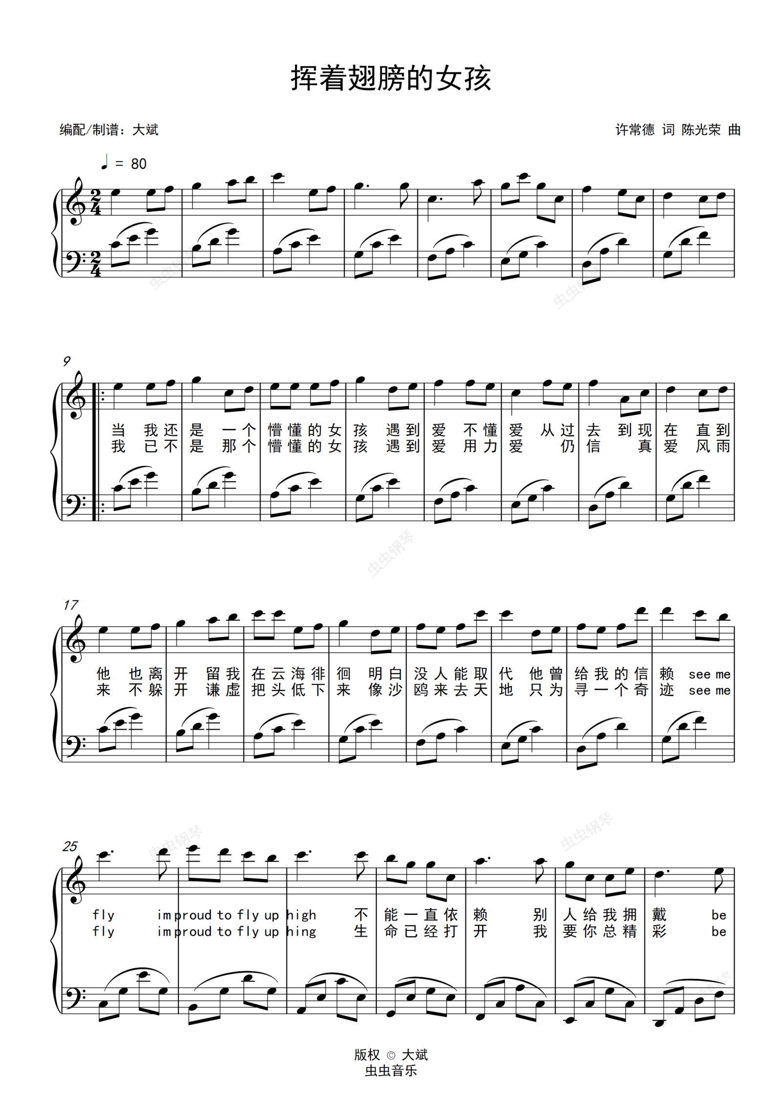钢琴谱:挥着翅膀的女孩(简单C调弹唱)