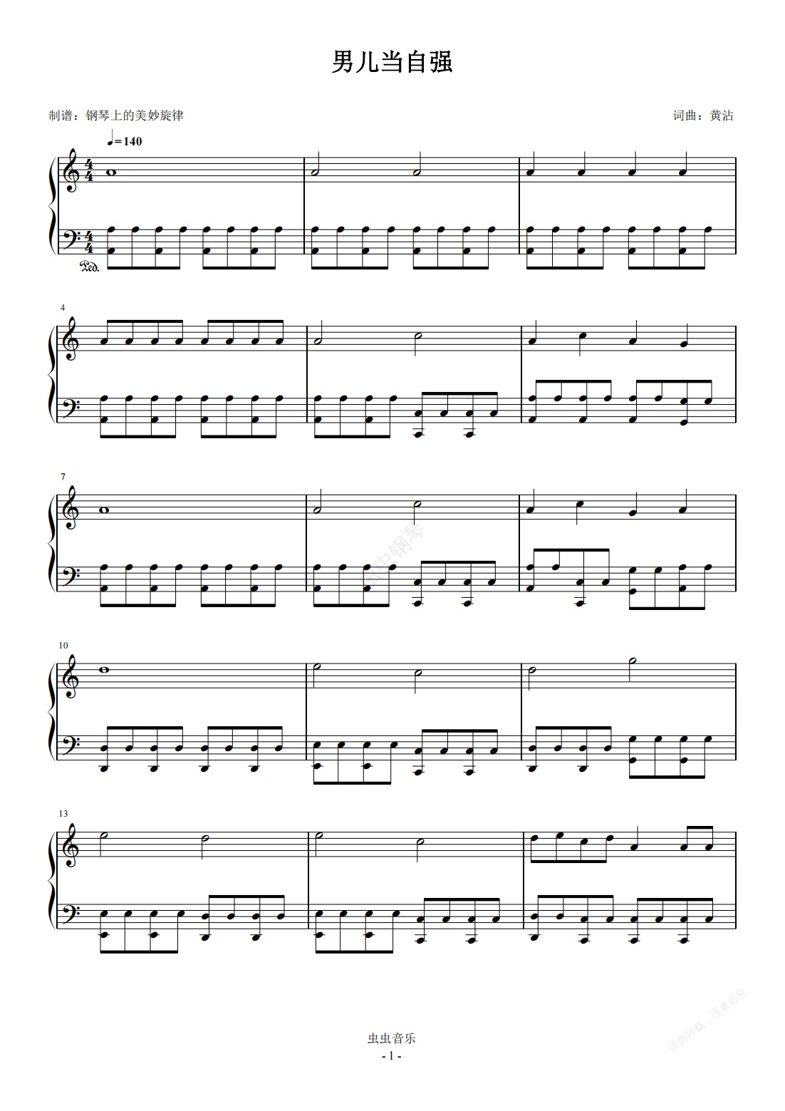钢琴谱:男儿当自强 C调简易版  林子祥