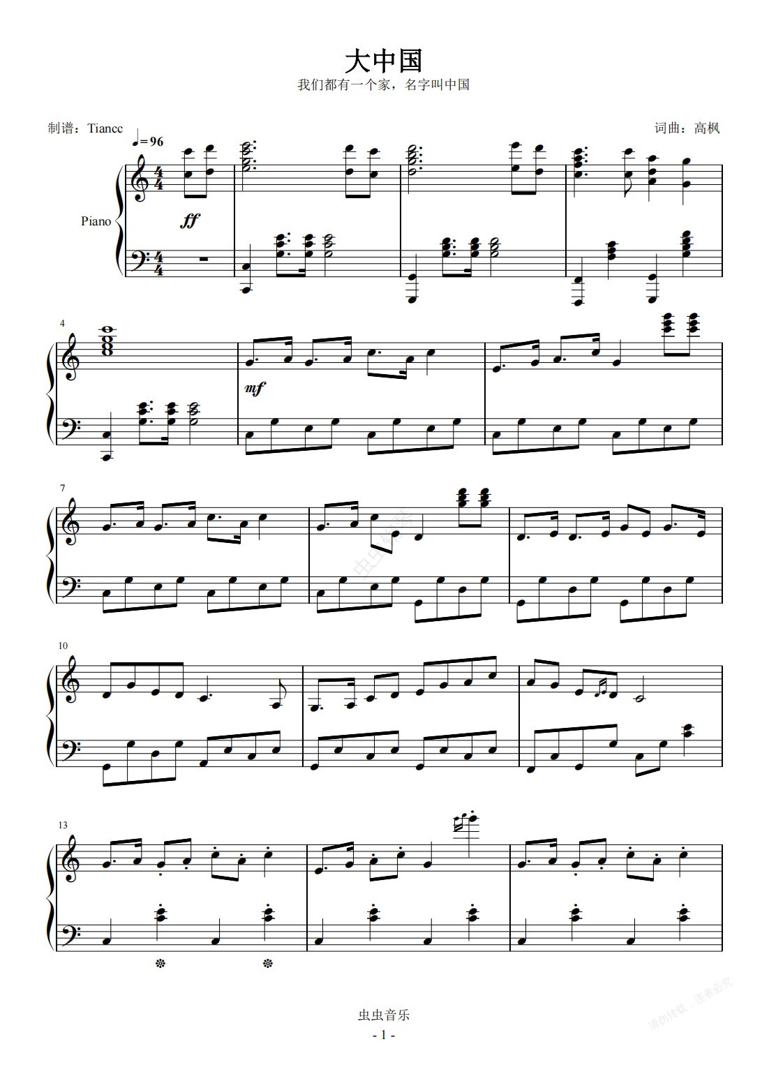 钢琴谱:《大中国》我们都有一个家,名字叫中国!599难度
