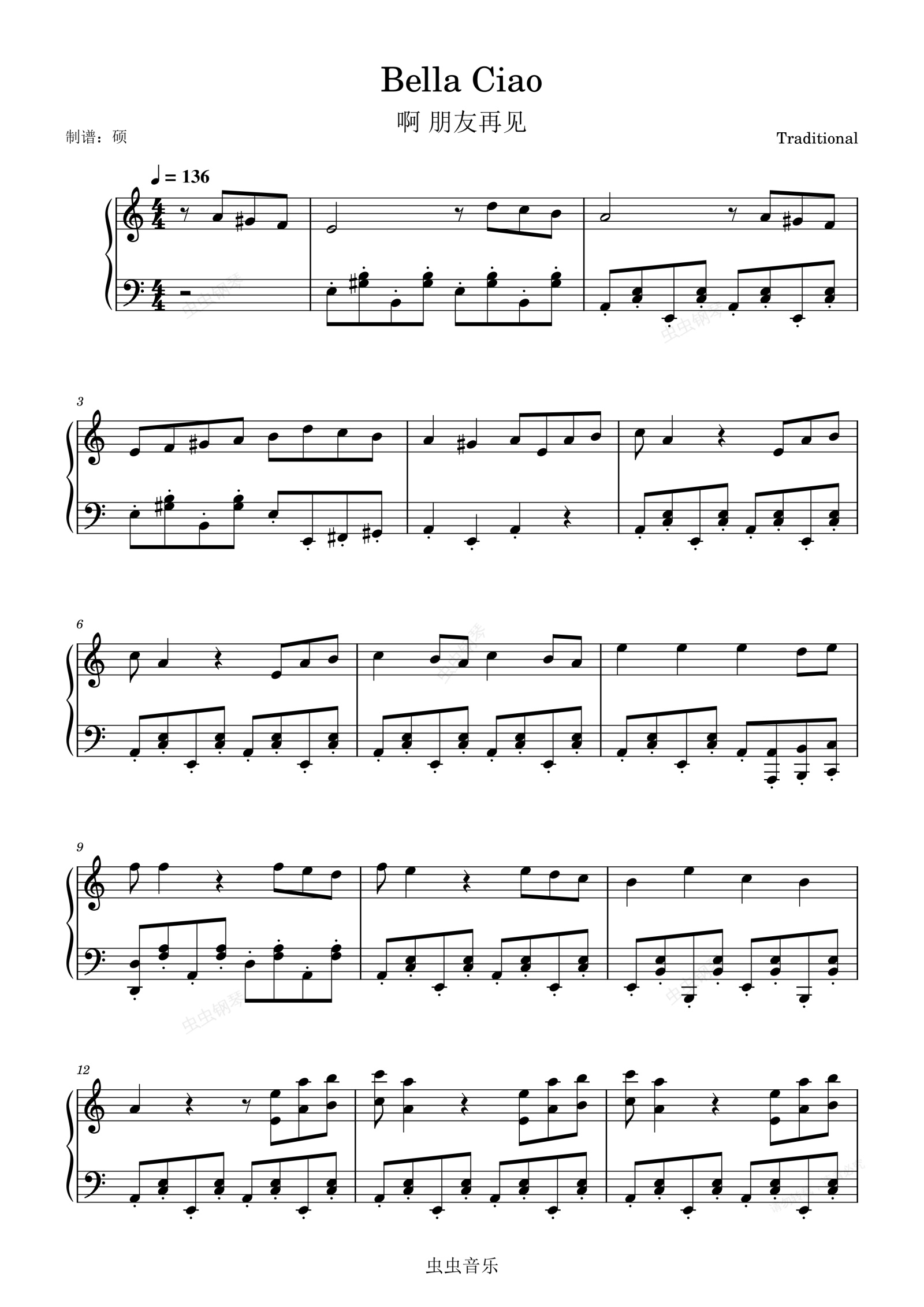 钢琴谱:Bella Ciao(啊 朋友再见)