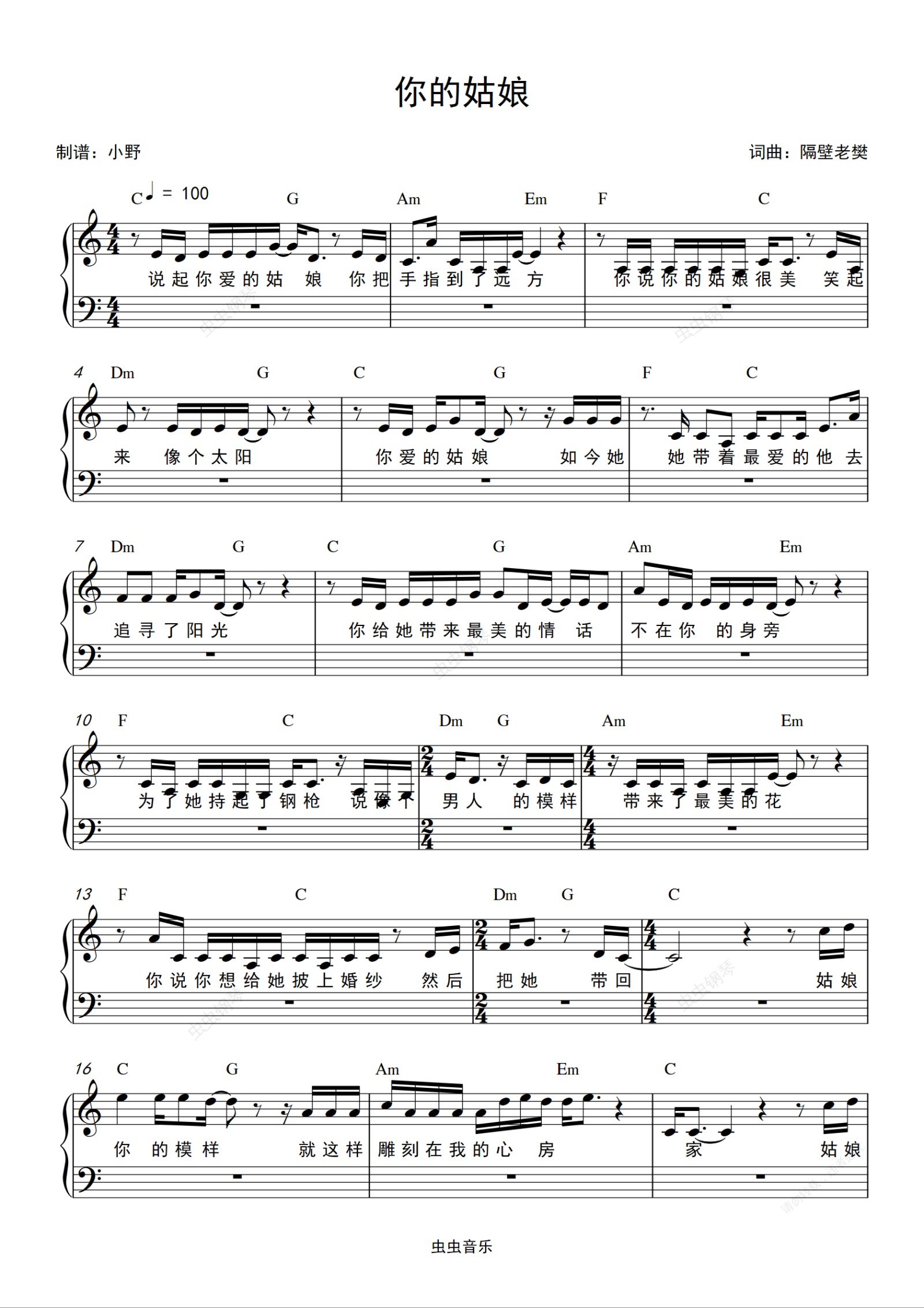 钢琴谱:你的姑娘(和弦弹唱版)