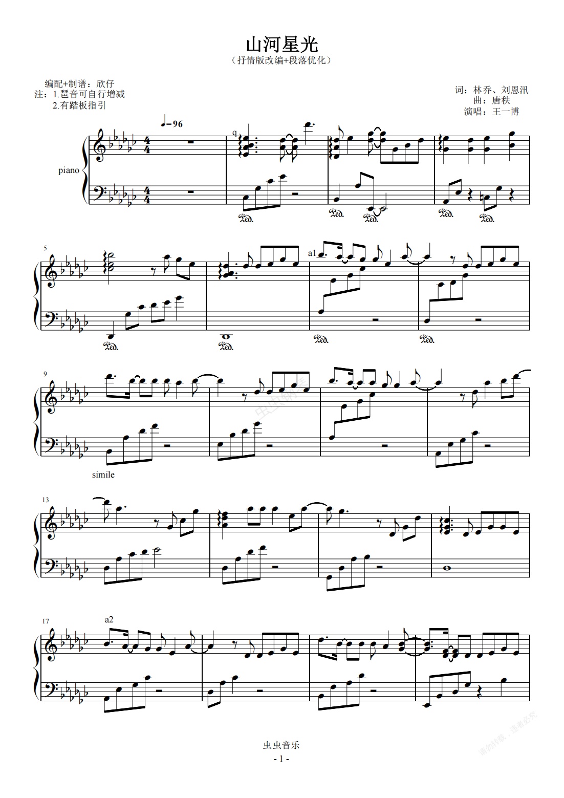 钢琴谱:王一博-降G《山河星光》(抒情版+段落优化)