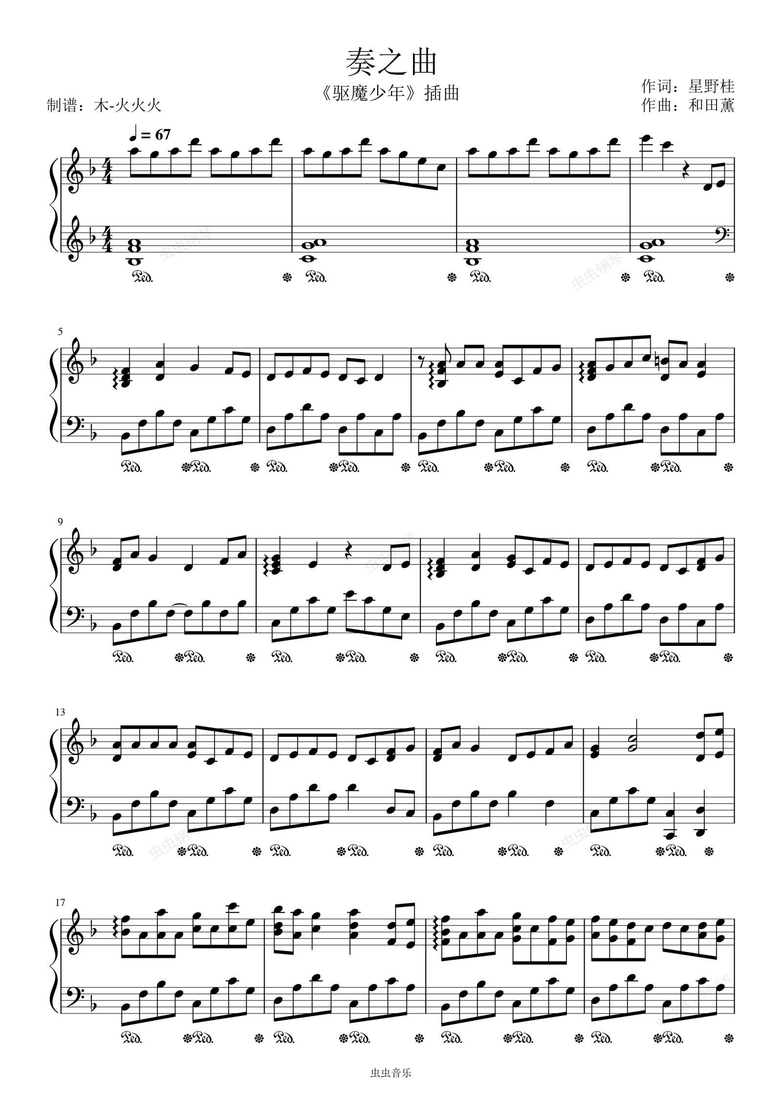 钢琴谱:奏之曲-《驱魔少年》插曲F调