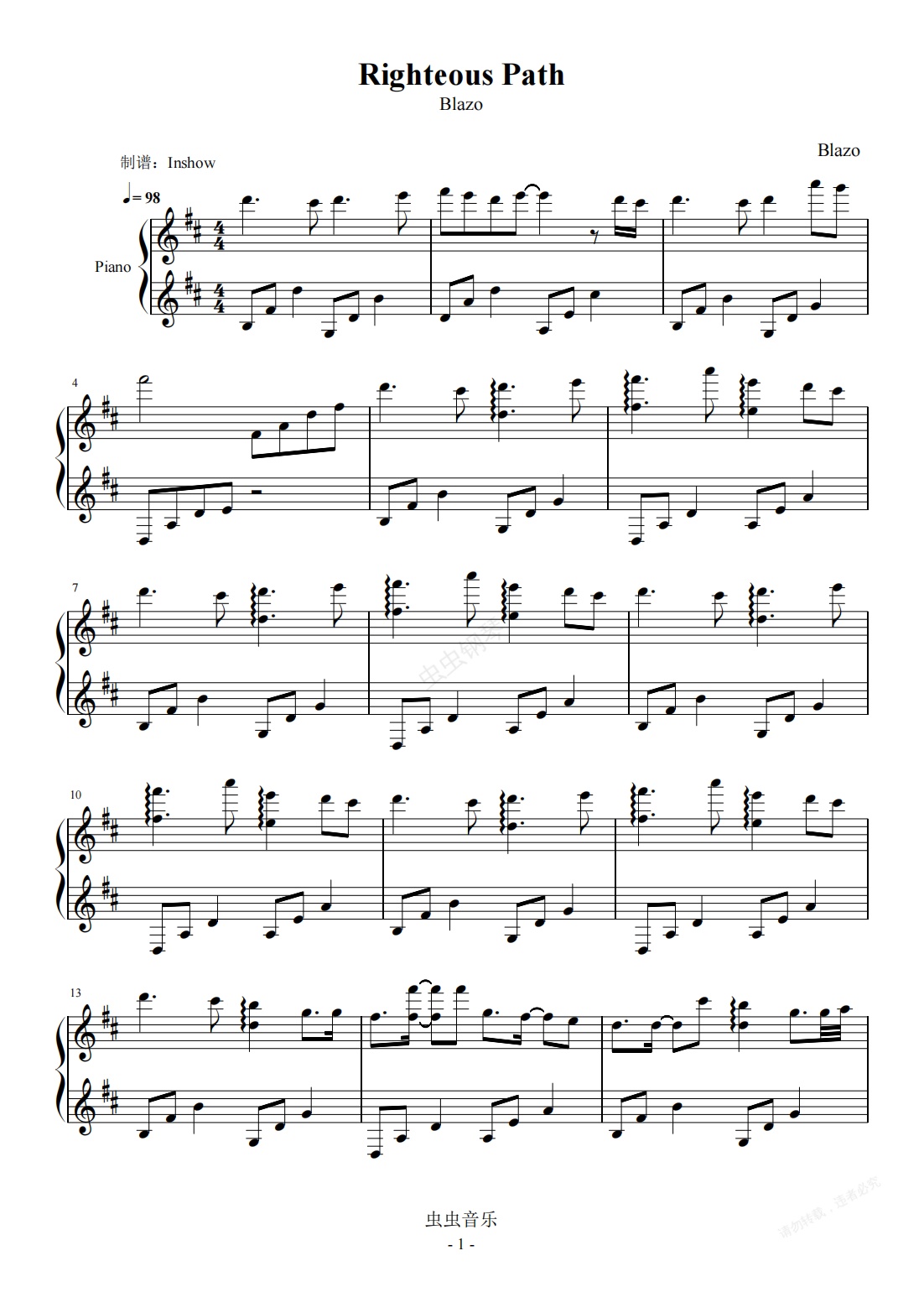钢琴谱:Righteous Path【独奏】- Blazo -