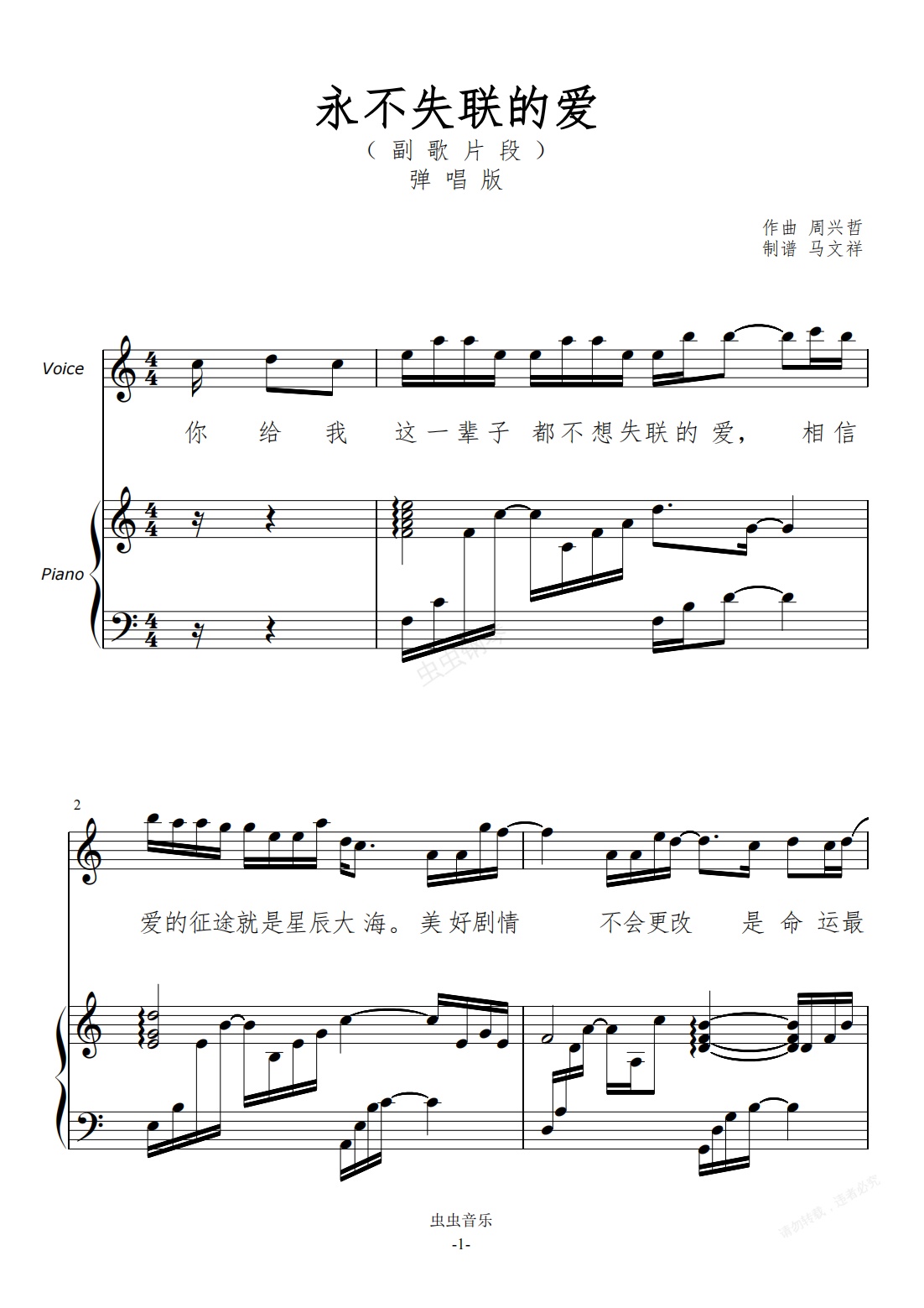 钢琴谱:永不失联的爱-C调副歌弹唱版