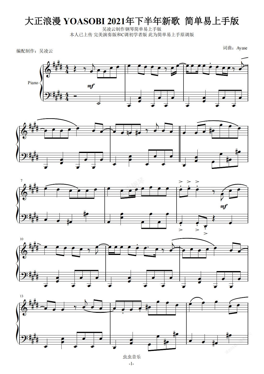 钢琴谱:大正浪漫 YOASOBI 2021年下半年新歌 简单易上手版