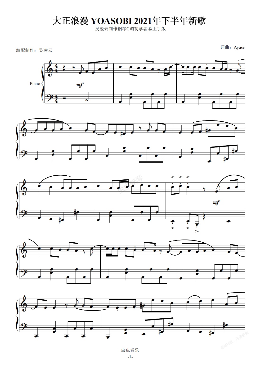 钢琴谱:大正浪漫 YOASOBI 2021年下半年新歌 C调初学者易上手版