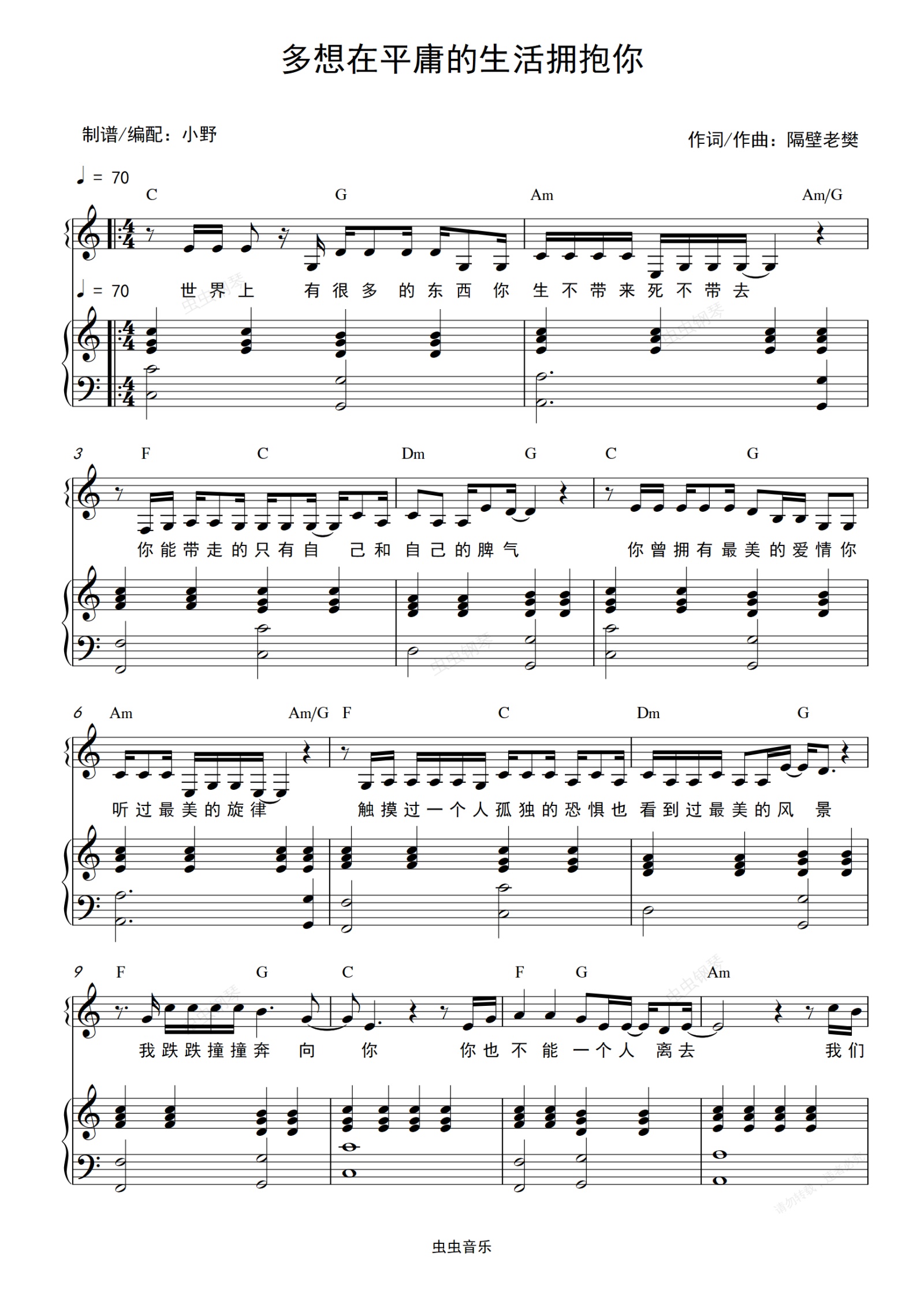 钢琴谱:多想在平庸的生活拥抱你(和弦弹唱版)