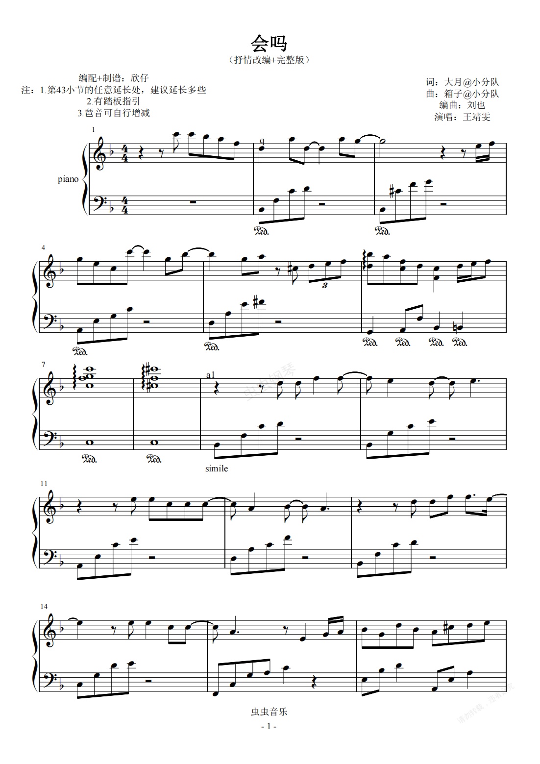 钢琴谱:王靖雯不胖-F《会吗》(抒情改编+完整版)