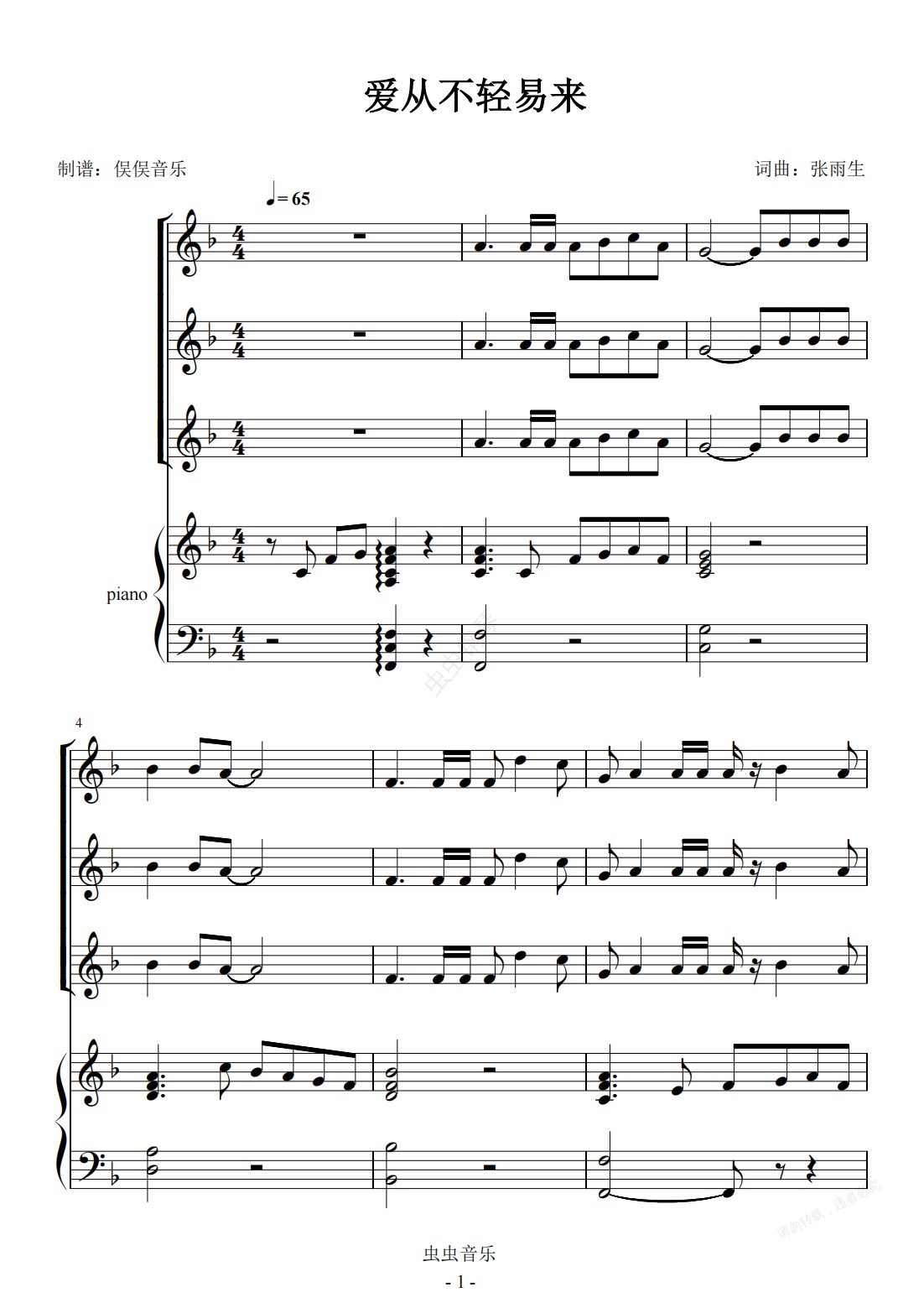 钢琴谱:爱从不轻易来(合唱伴奏谱)