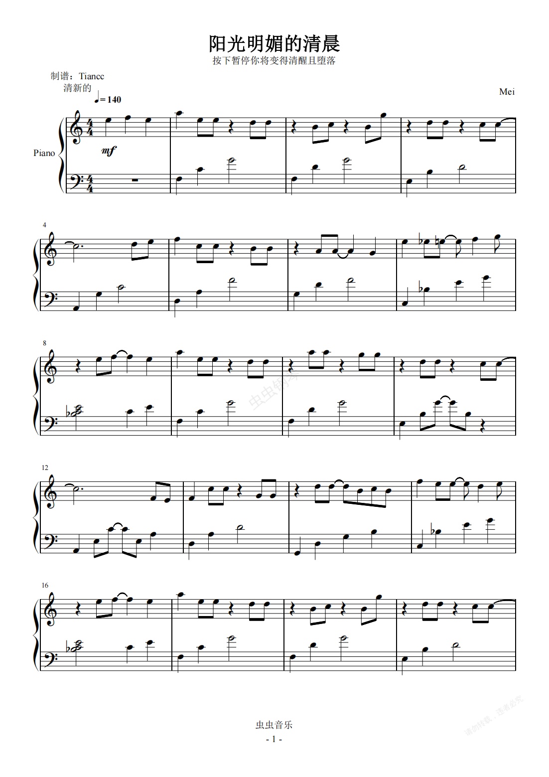 钢琴谱:《阳光明媚的清晨》按下暂停键你将变得清醒且堕落,C调599难度