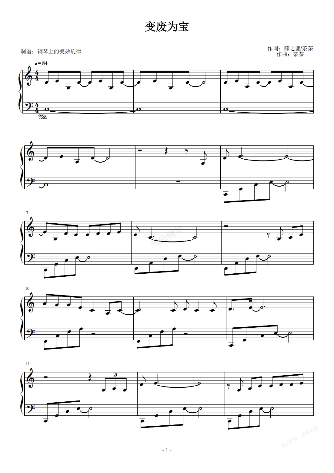 钢琴谱:变废为宝 C调简易版 薛之谦