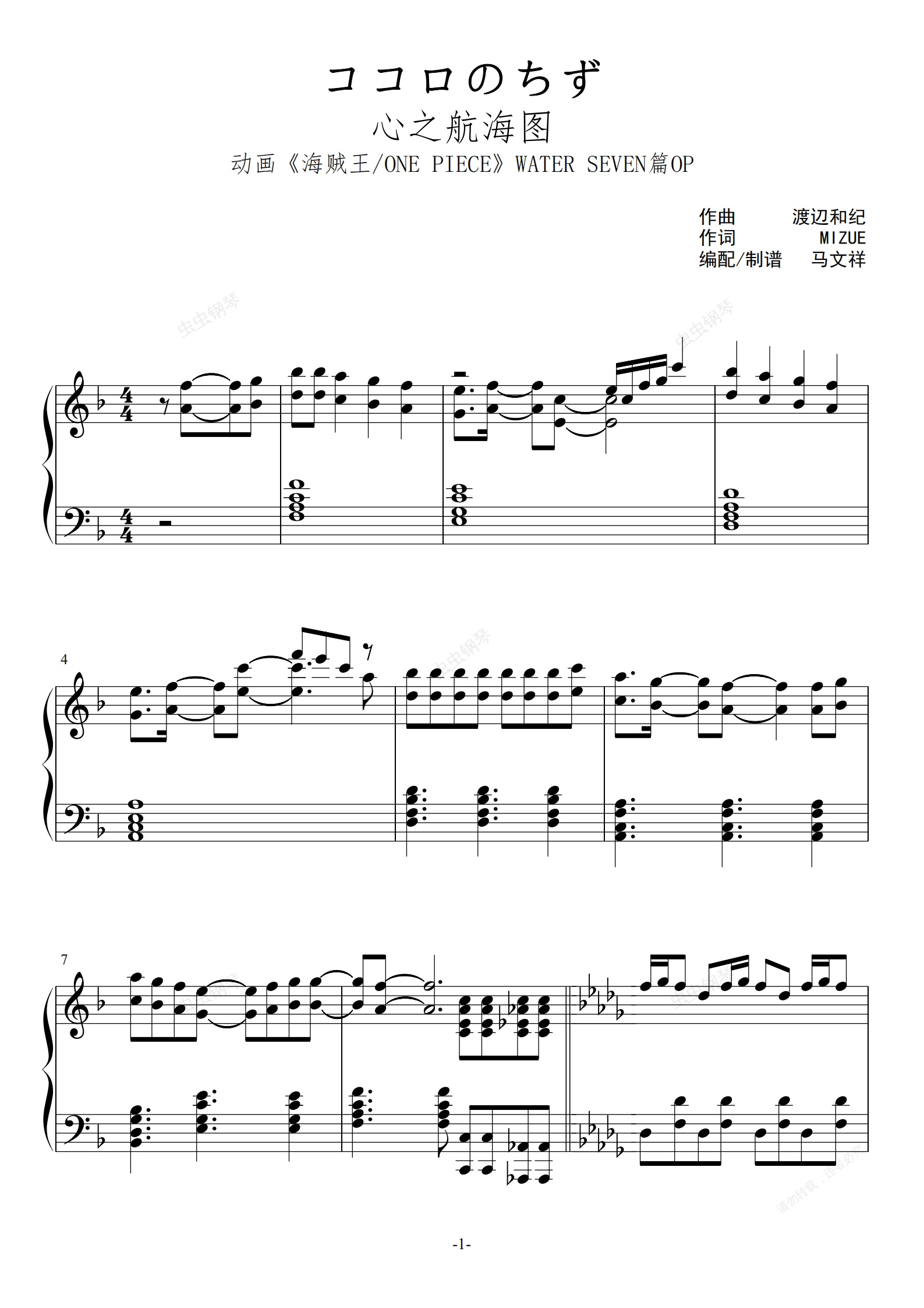 钢琴谱:ココロのちず/海贼王七水之都篇OP