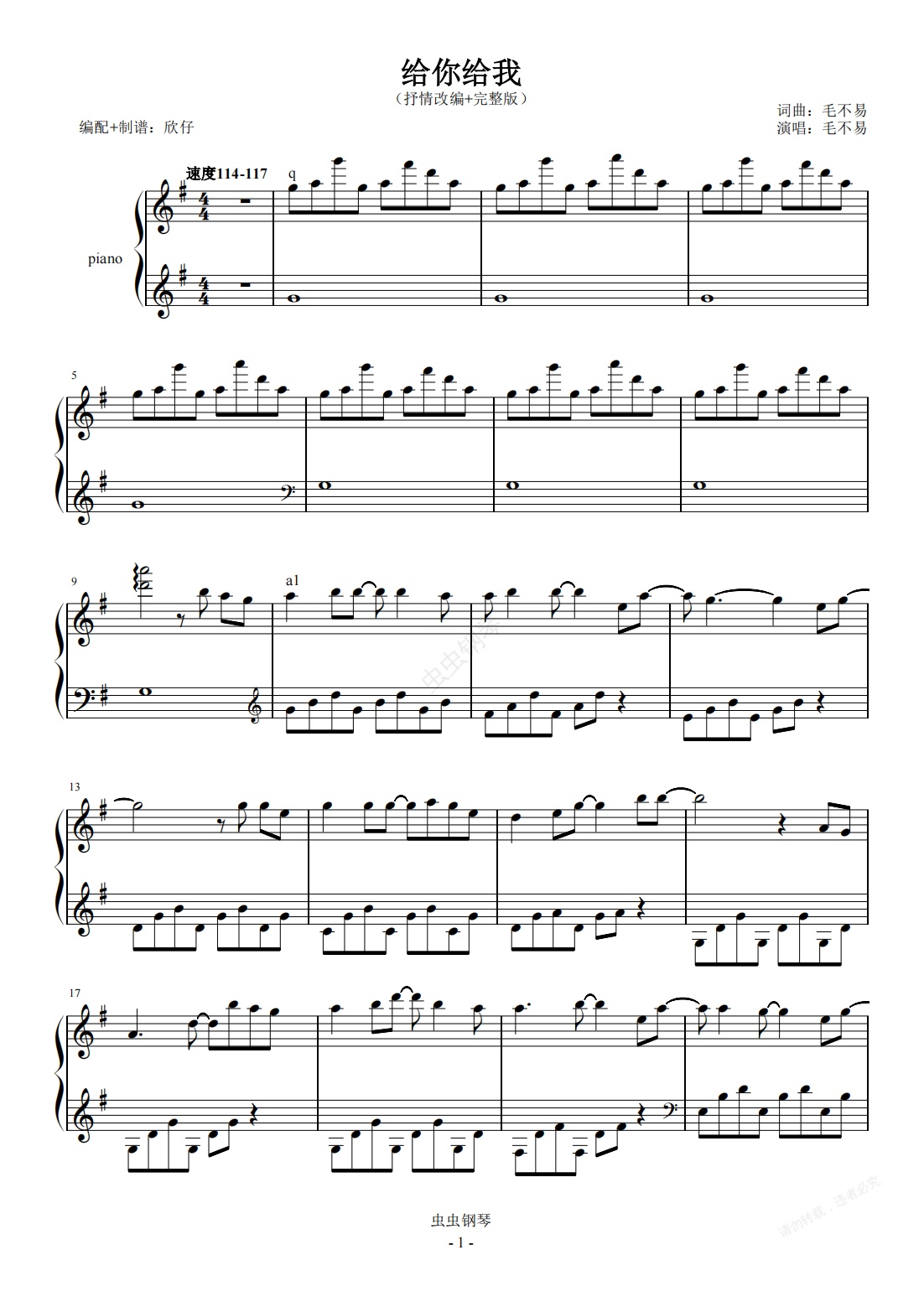 钢琴谱:毛不易-G《给你给我》(抒情改编+完整版)