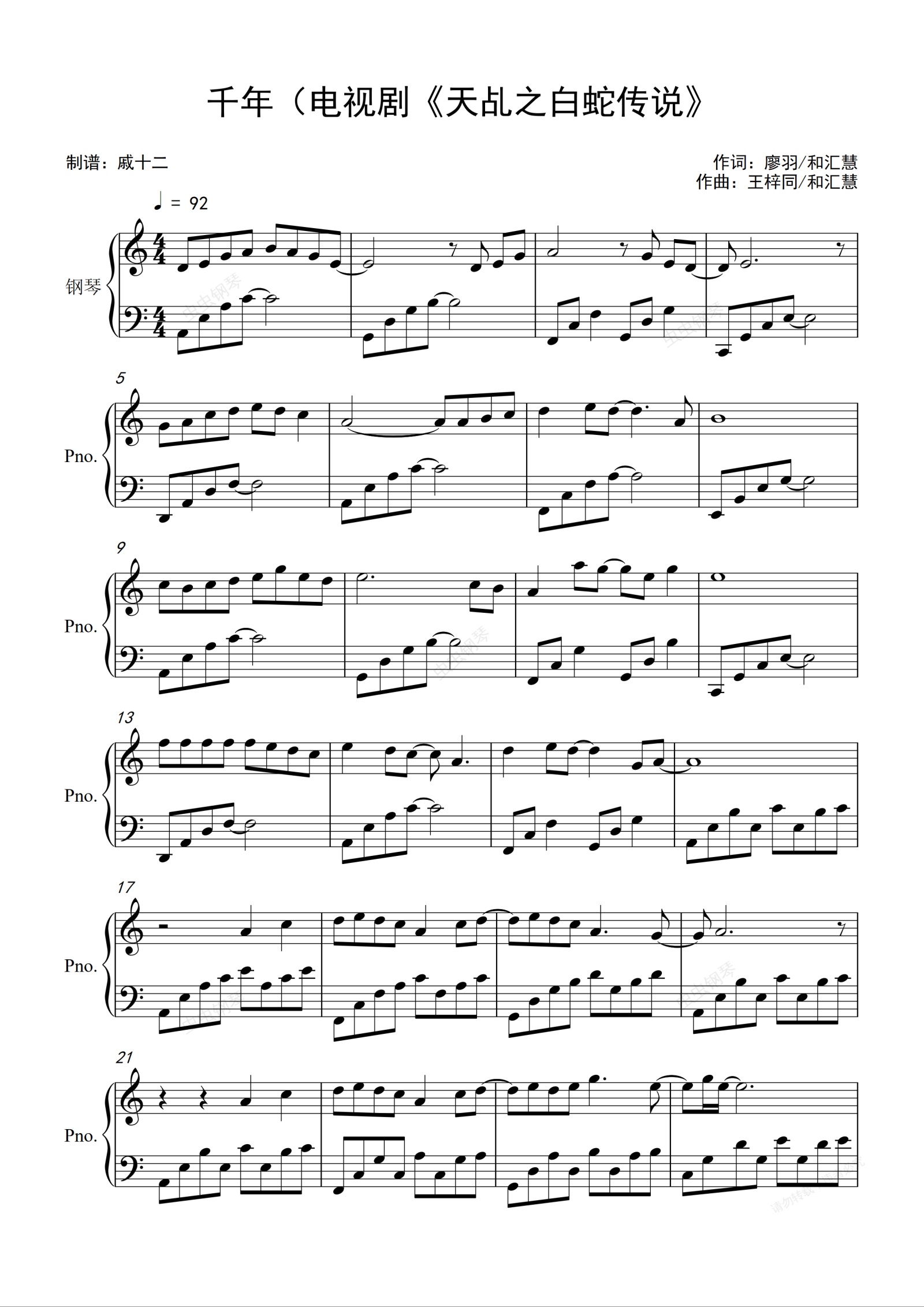 钢琴谱:千年《天乩之白蛇传说》插曲-C调简单版
