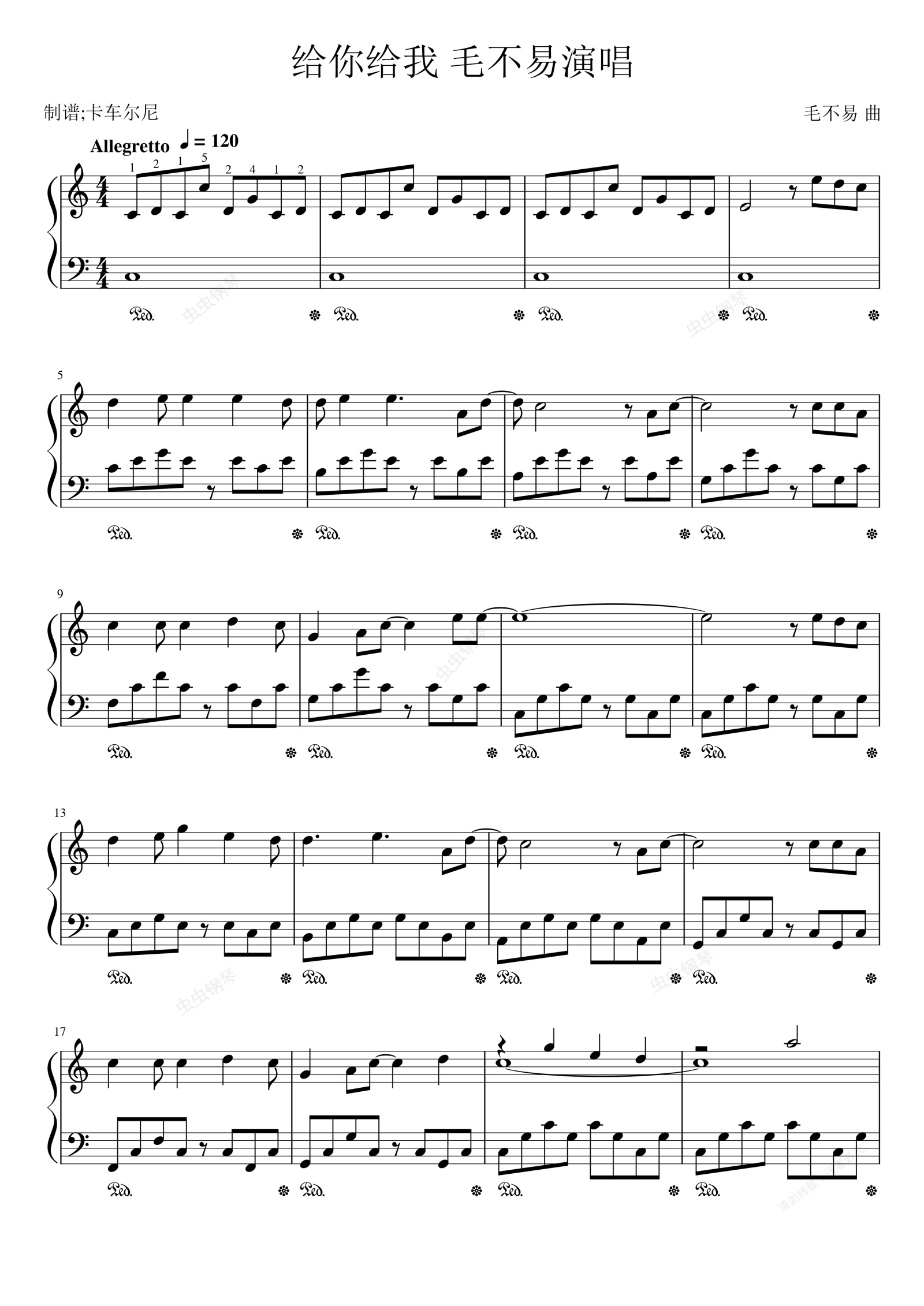 钢琴谱:毛不易演唱 给你给我 C大调简单易弹版