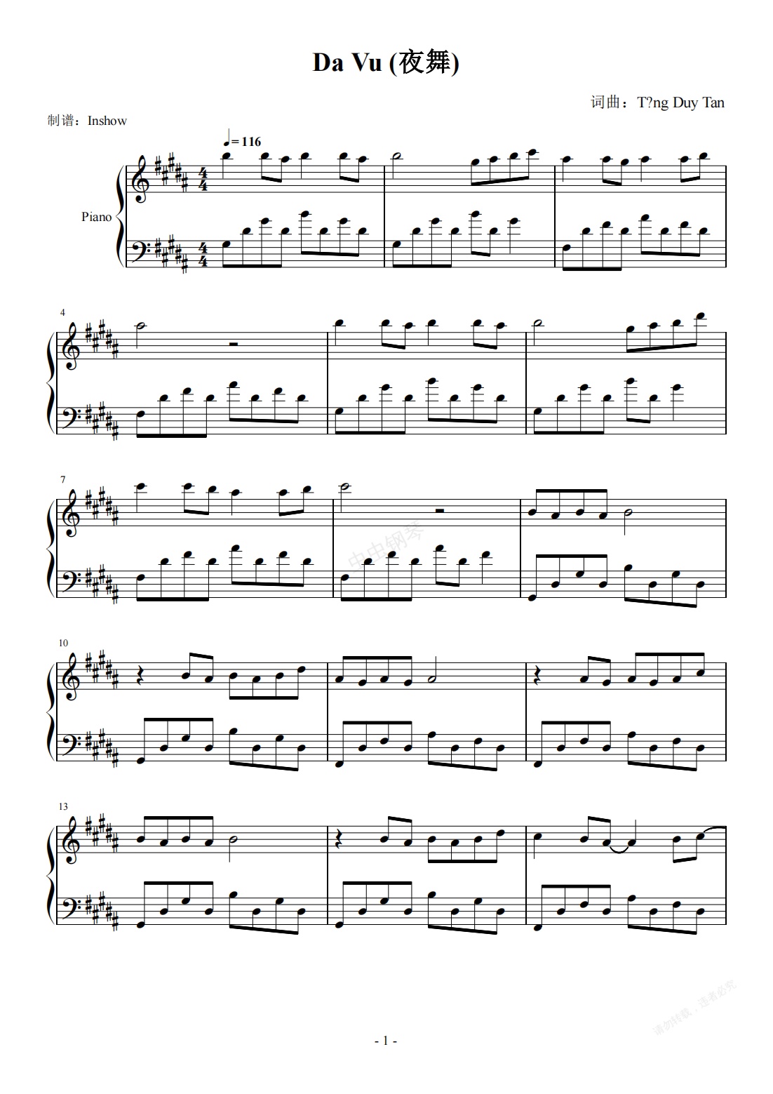 钢琴谱:Da Vu(夜舞)【独奏】- Tăng Duy Tân、BAE - #抖音#