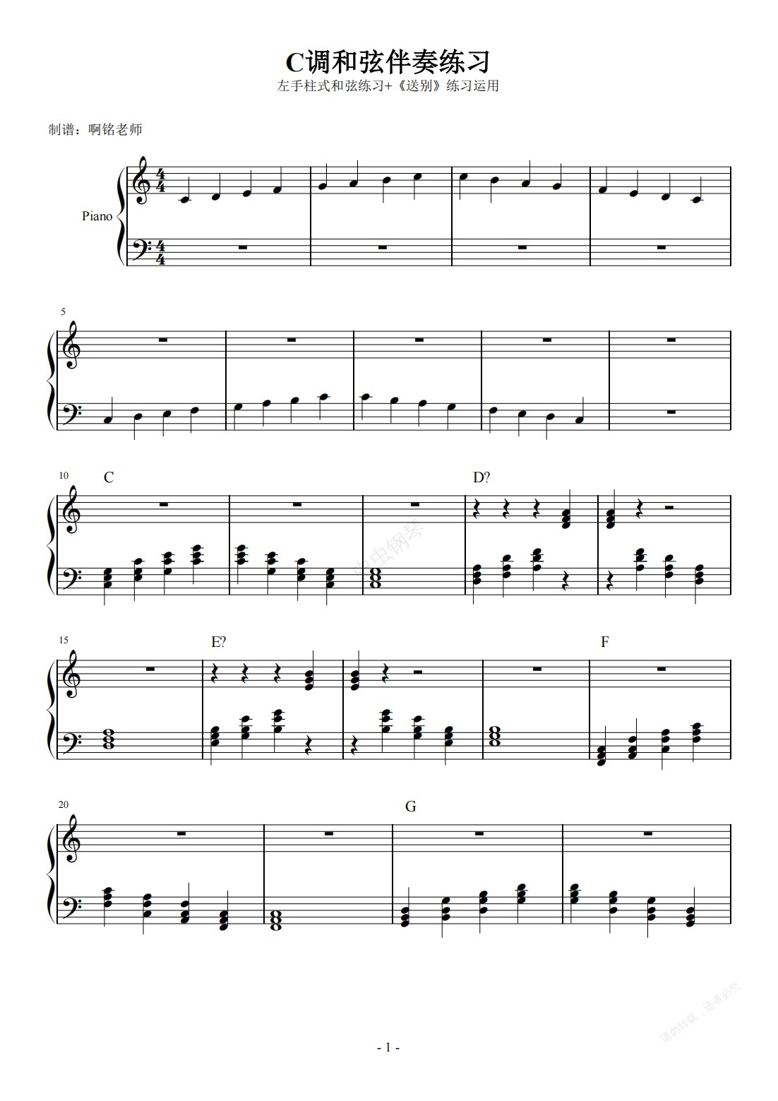 钢琴谱:C调即兴伴奏柱式练习+ 送别
