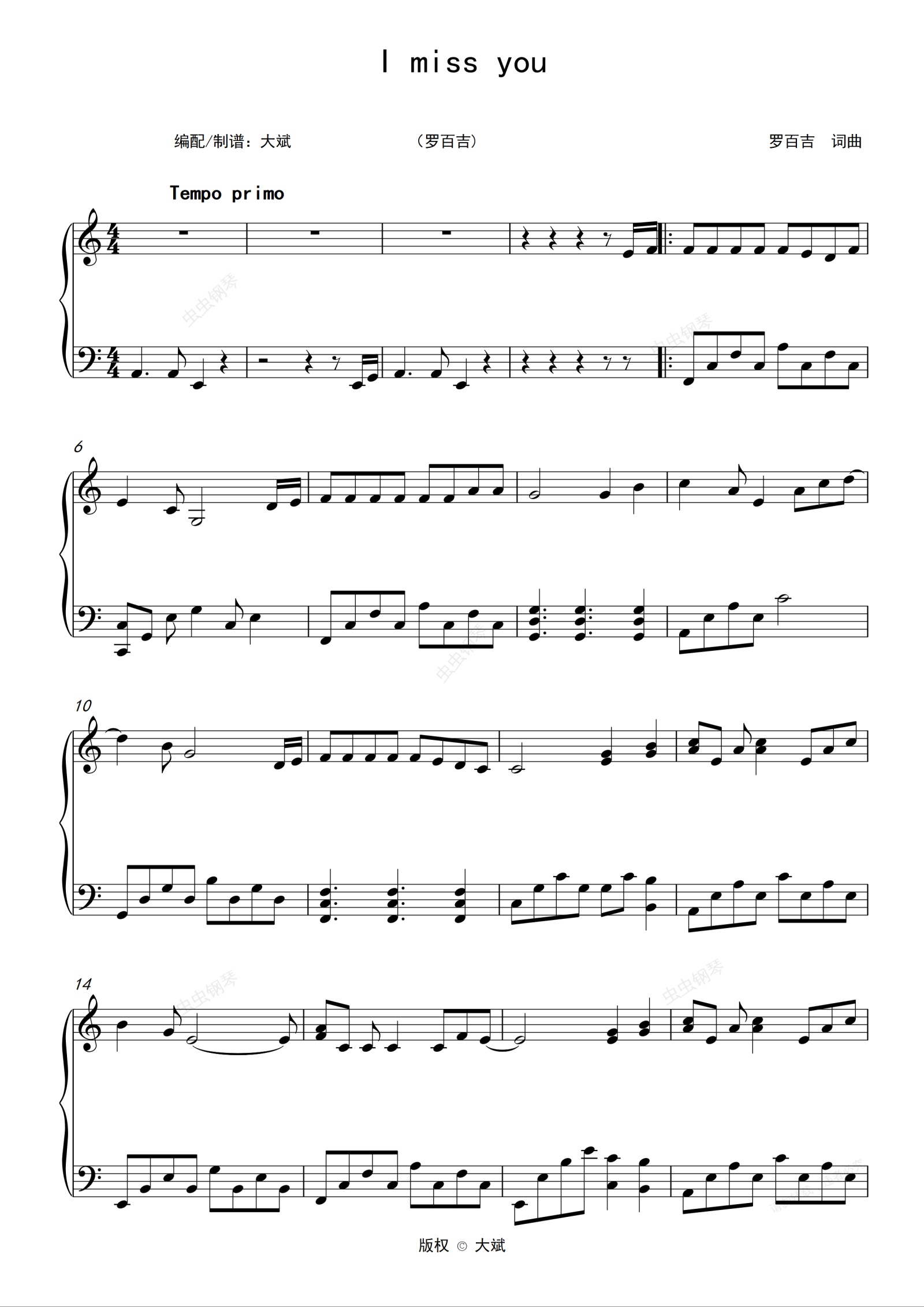 钢琴谱:i miss you (C调简易)