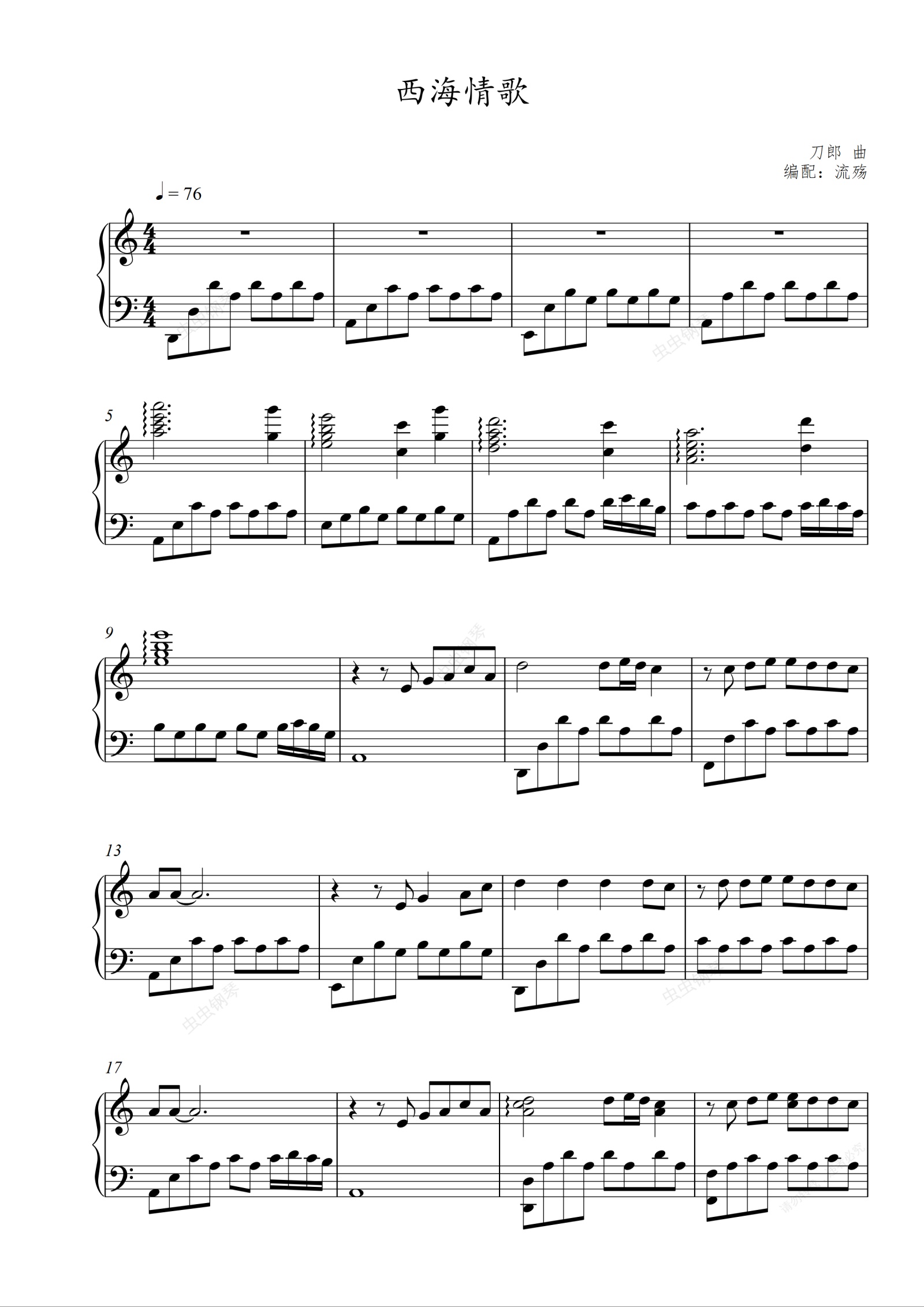 瑛与勇儿都是大学学生,然后一同报名参加了环保志愿者,一同来到零下40摄氏度的可可西里,因高寒缺氧而被称为“生命禁区”。勇儿被安排在条件艰苦的陀陀河观察站,勇儿牺牲在收集资料的路上,这是在可可西里第一个牺牲的志愿者。刀郎在一次采风中,听到了流传在西海的这个故事,他感动之余为瑛和勇儿的爱情故事写下了《西海情歌》。原调黑键较多,C调演奏难度略低一些
