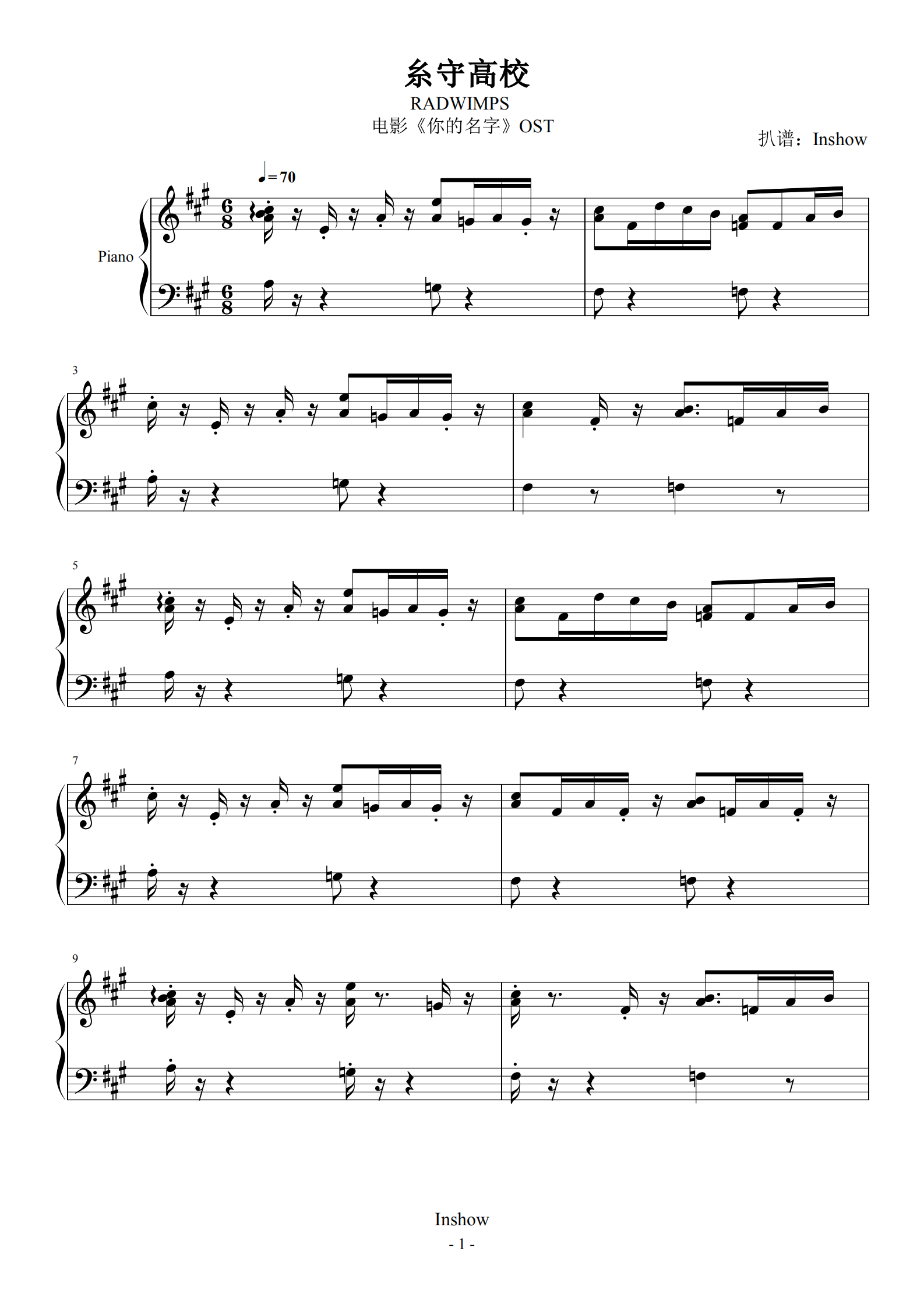 钢琴谱:电影《你的名字》OST- 糸守高校