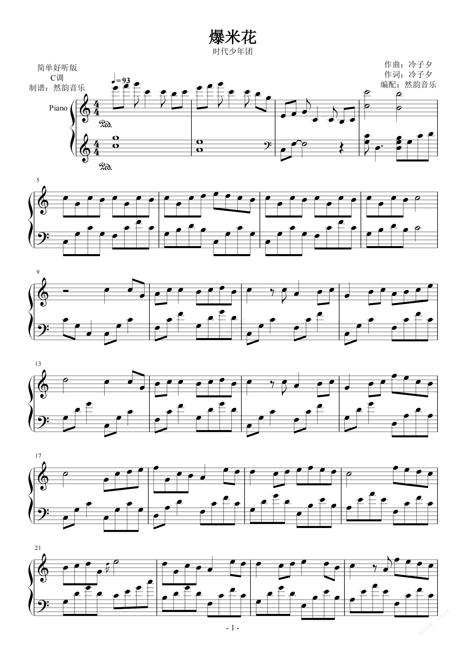 钢琴谱:【C调免费】爆米花-TNT时代少年团【简单易学版】然韵音乐编配