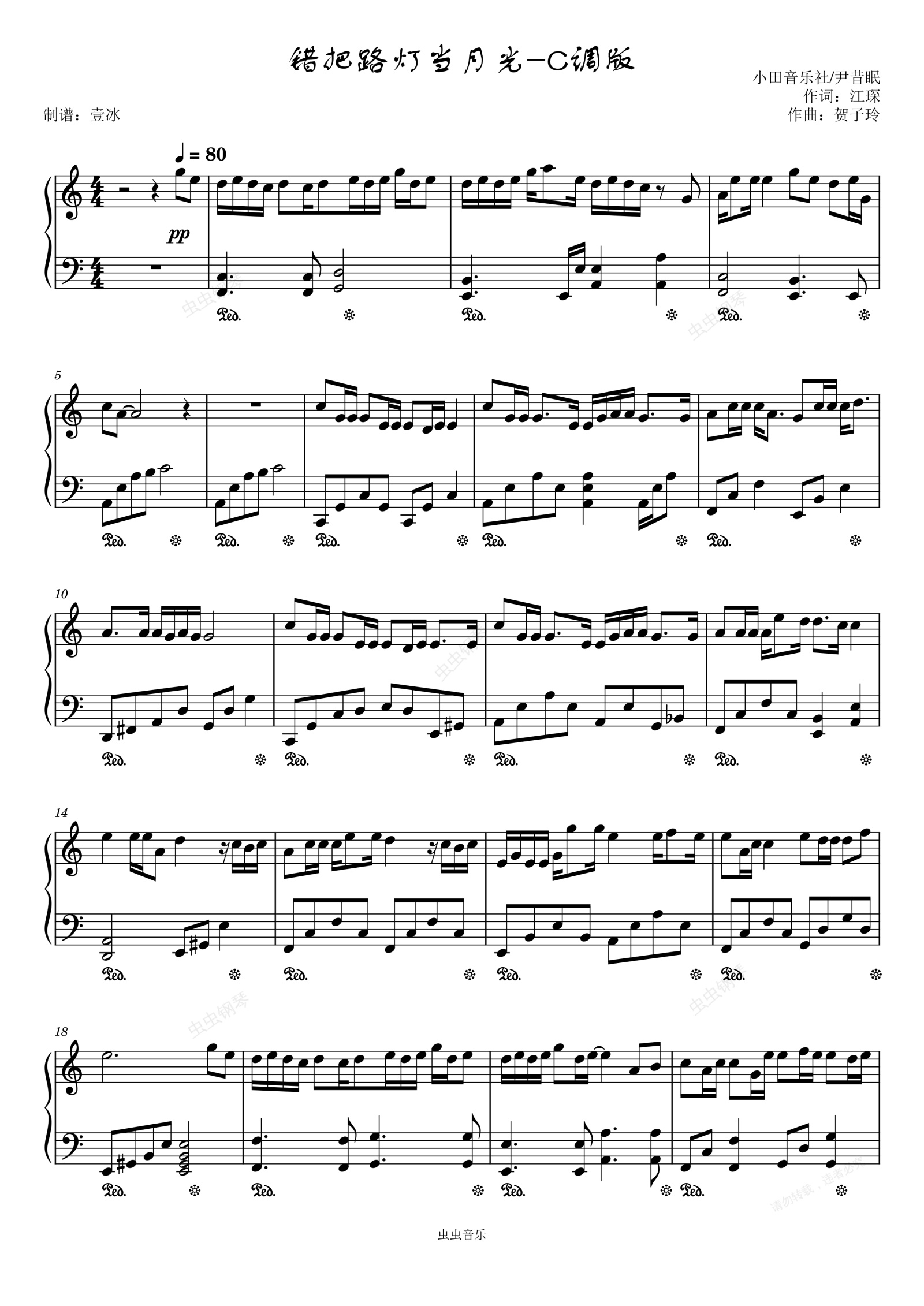 钢琴谱:错把路灯当月光//小田音乐社/尹昔眠-C调版