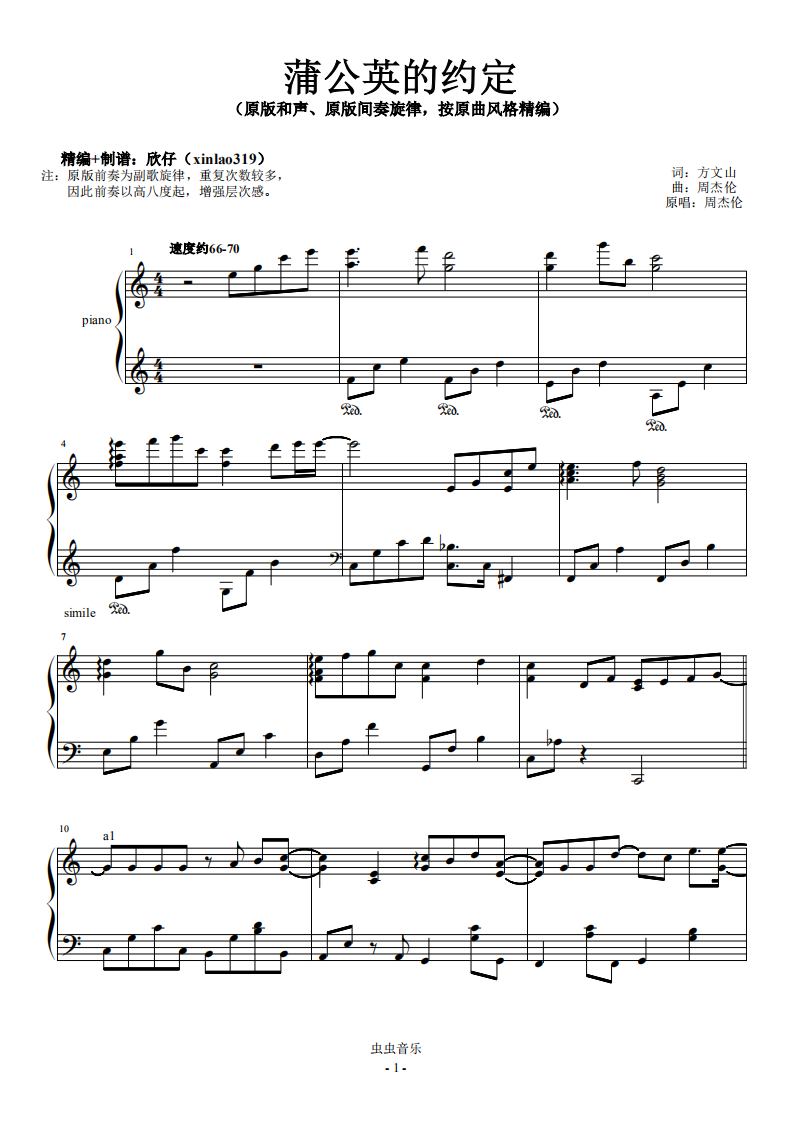 钢琴谱:蒲公英的约定(原版和声+原版间奏+精编完整版)
