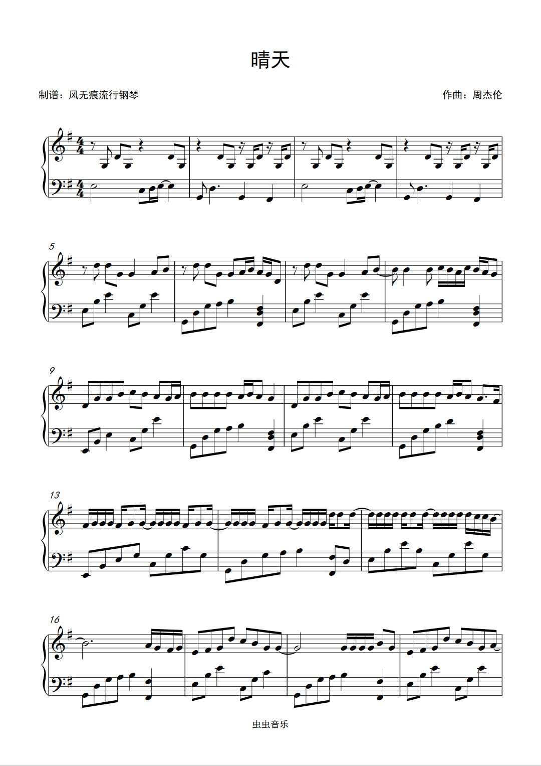 钢琴谱:晴天-周杰伦〖简易动听〗