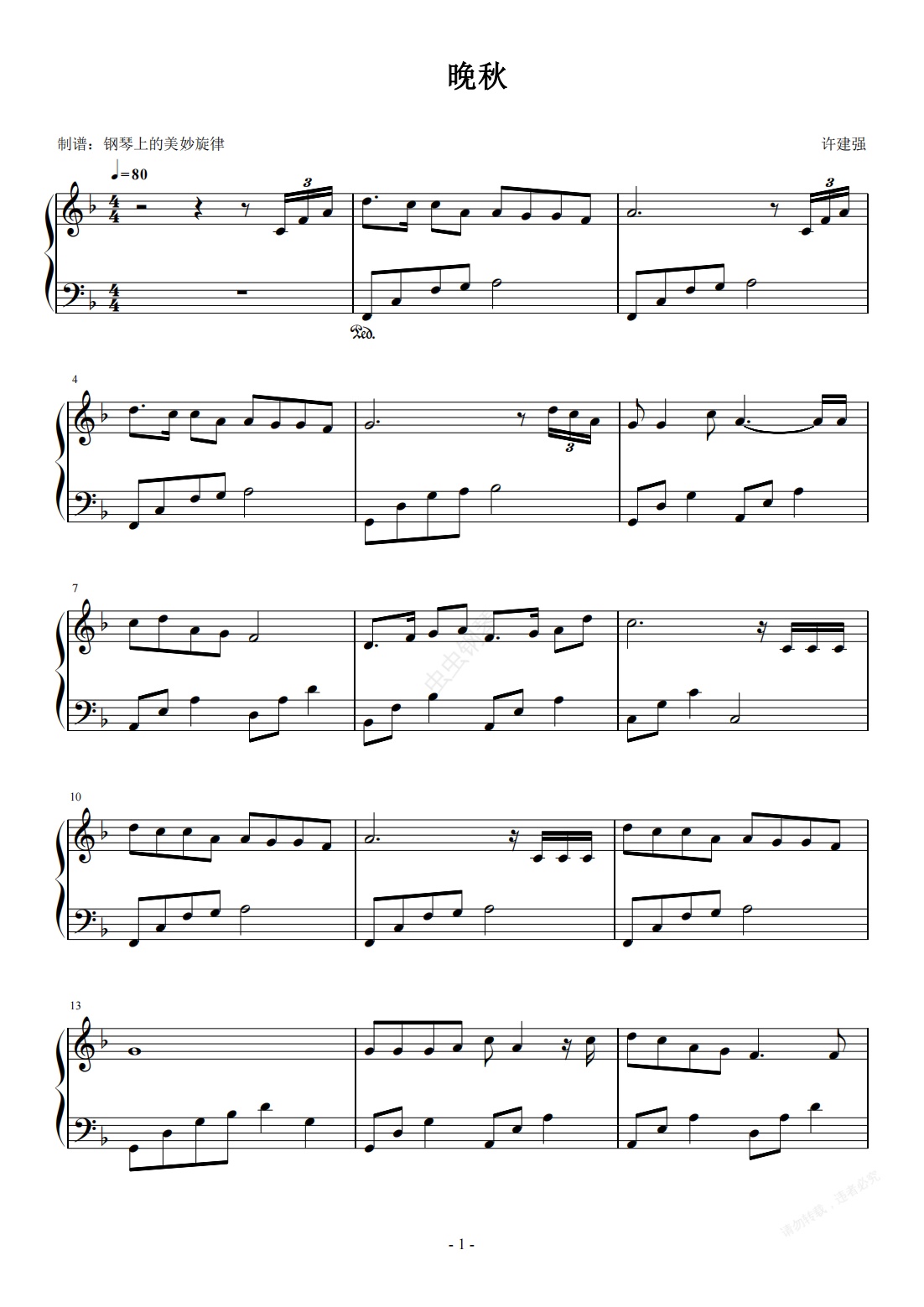 钢琴谱:晚秋 简易版 黄凯芹 经典流行