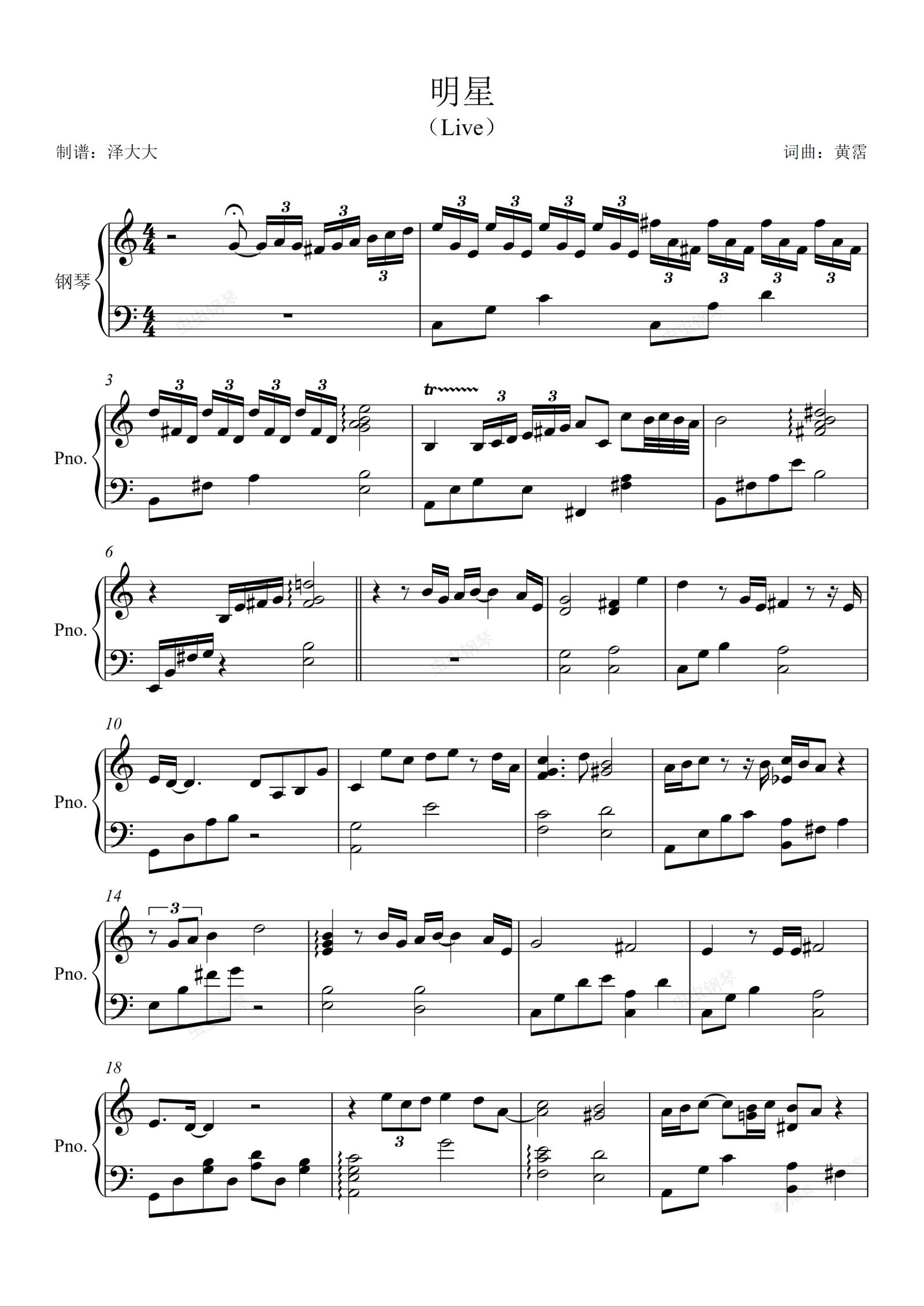 钢琴谱:明星【Live完美独奏版】泽大大 古巨基