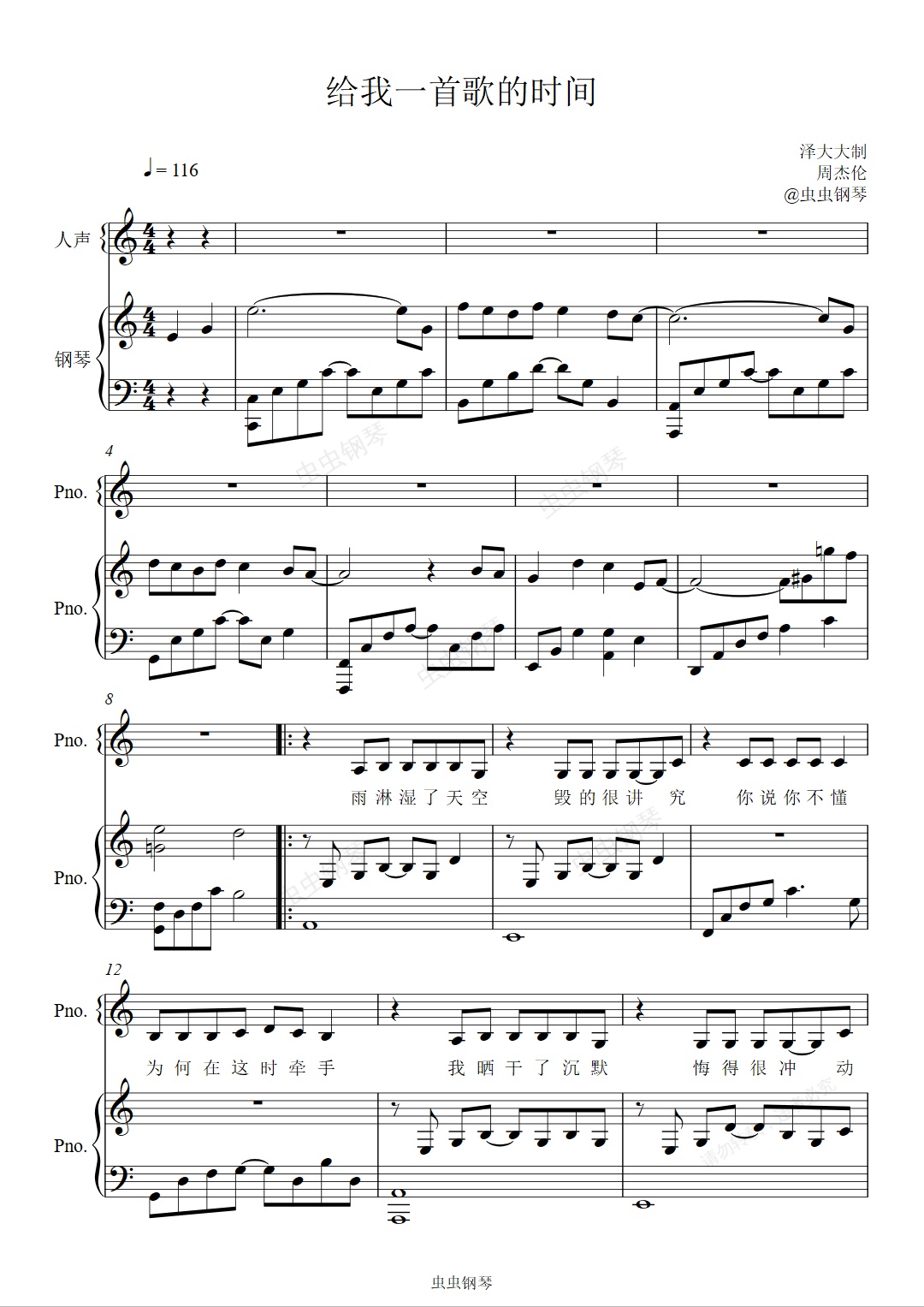 钢琴谱:给我一首歌的时间【C调完美弹唱附词】泽大大 周杰伦