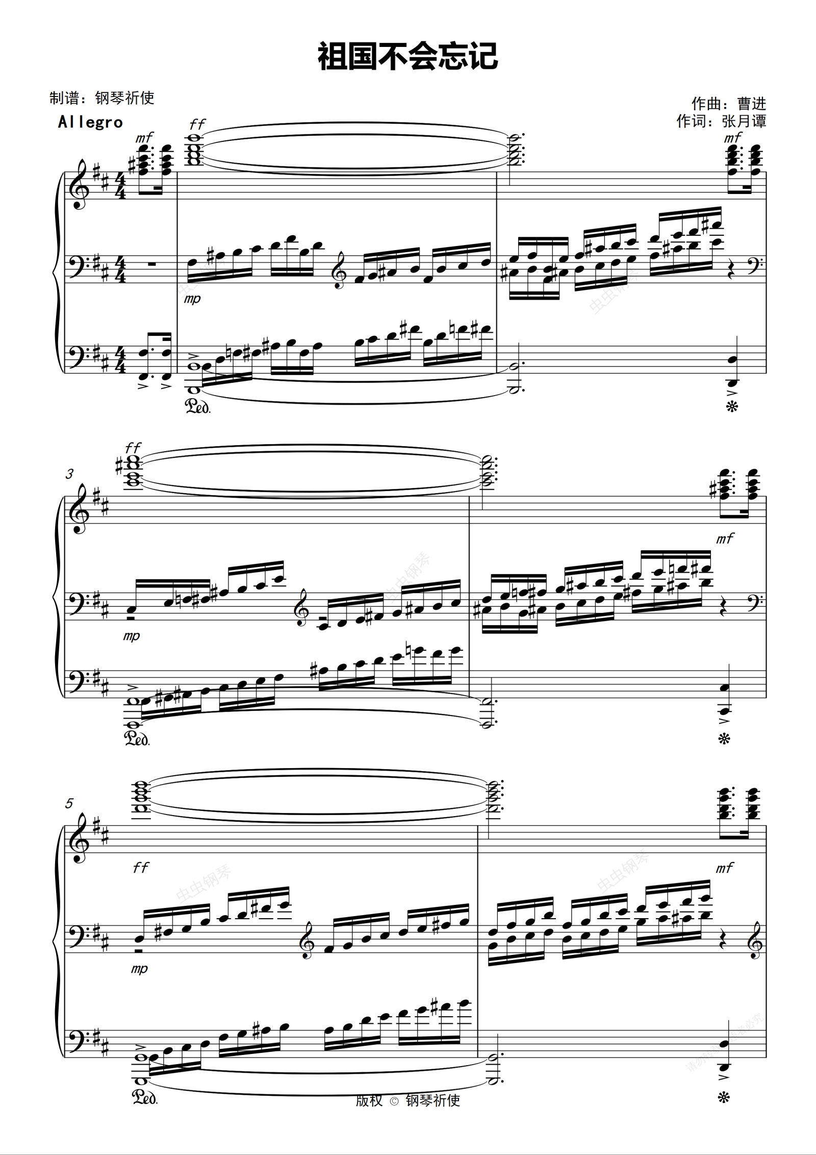 钢琴谱:祖国不会忘记钢琴改编独奏版