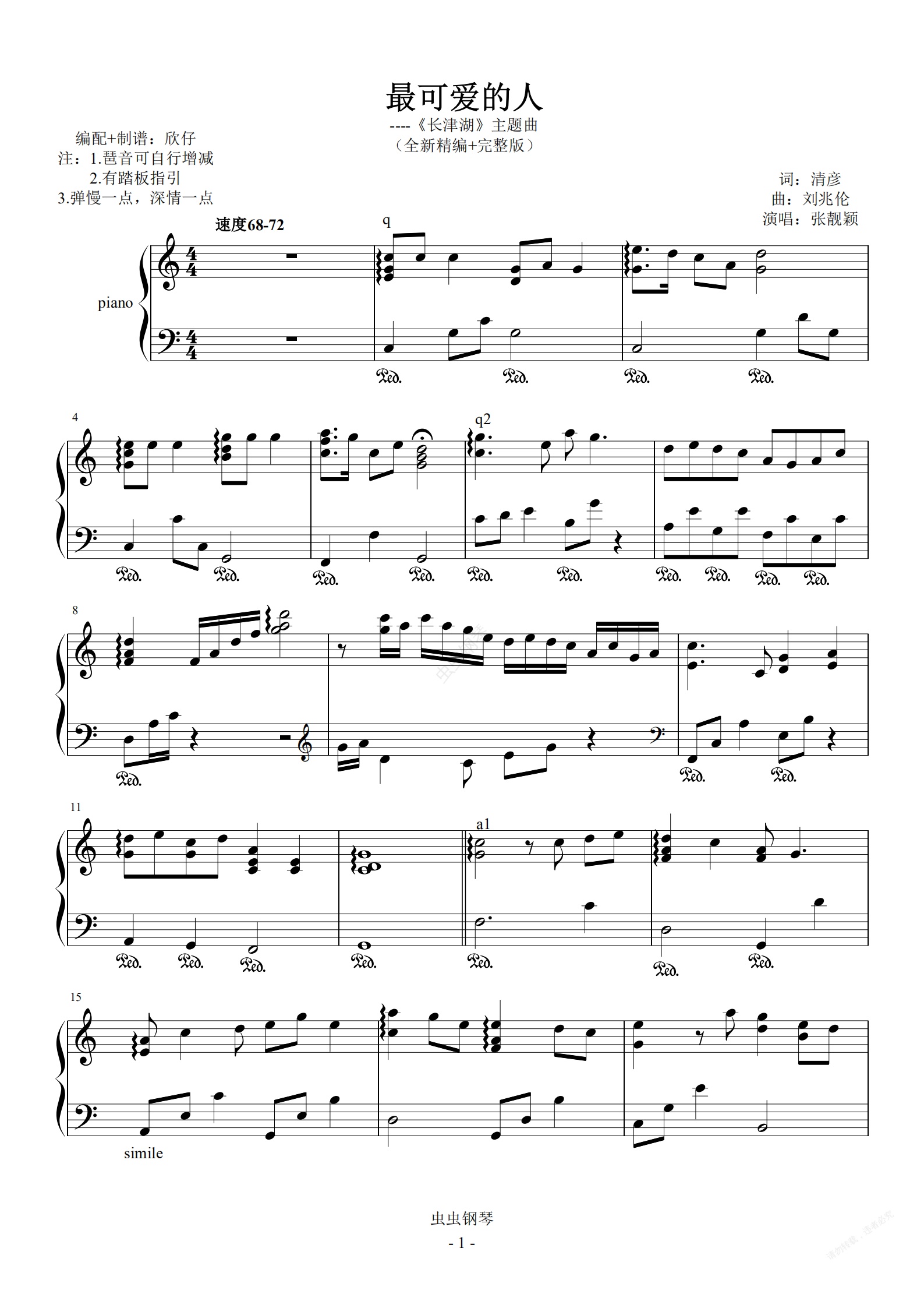 钢琴谱:张靓颖-C《最可爱的人》(《长津湖》主题曲、全新精编+完整版)