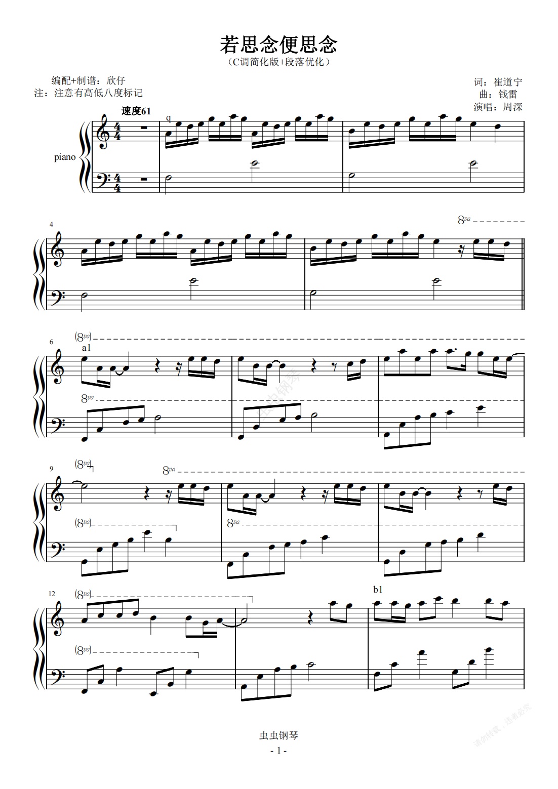 钢琴谱:周深-C简易版《若思念便思念》(C简+段落优化)