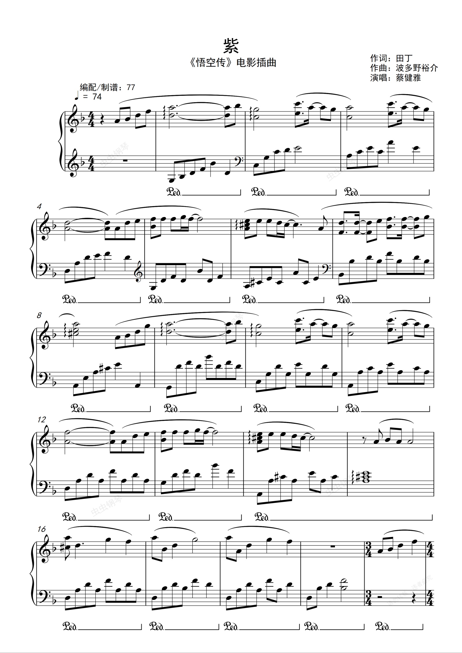 钢琴谱:蔡健雅-《紫》钢琴独奏谱 {悟空传}插曲
