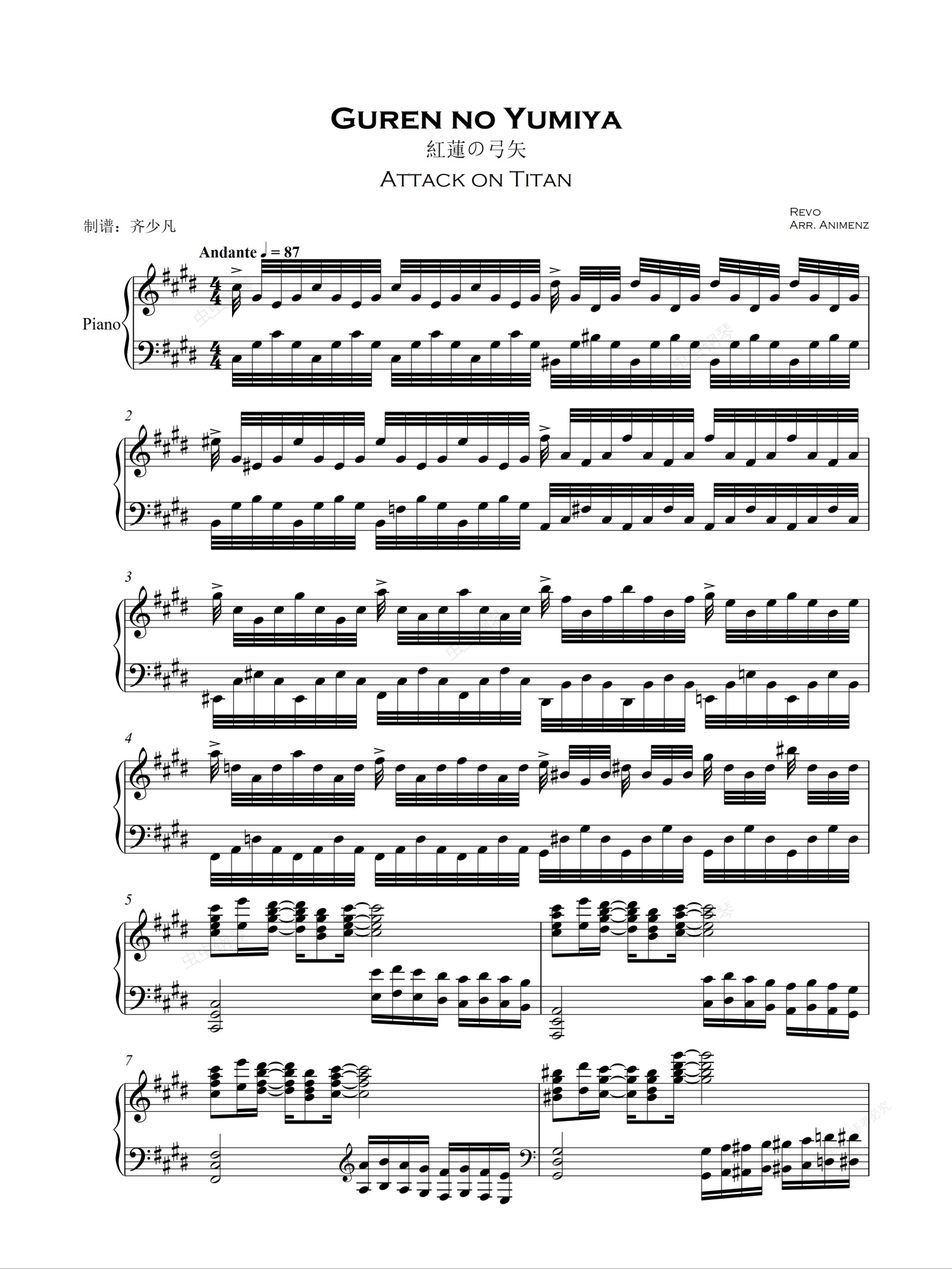 钢琴谱:红莲之弓矢 Guren no Yumiya Animenz版本
