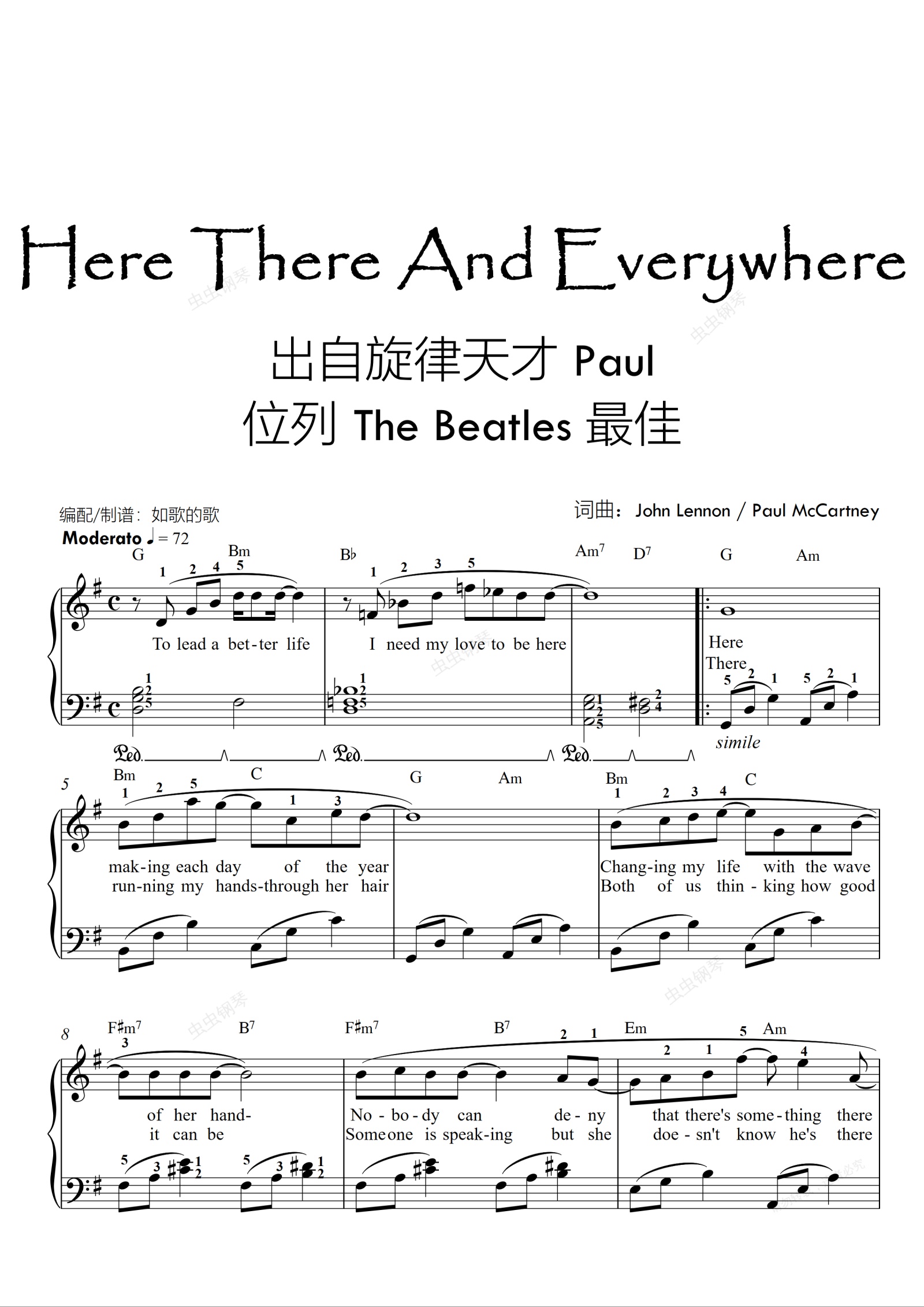 钢琴谱:Here there and everywhere简易好听经典The Beatles(指法&功能)