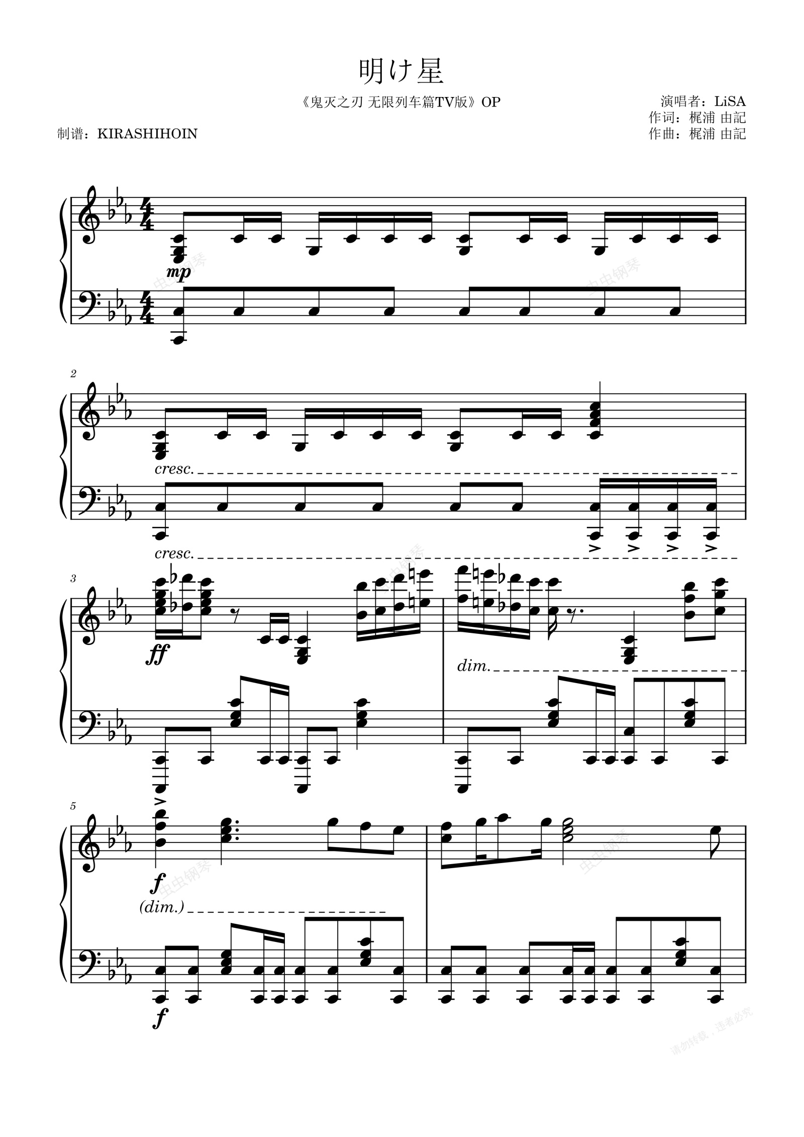 钢琴谱:明け星(《鬼灭之刃 无限列车篇TV版》OP/片头曲)- LiSA