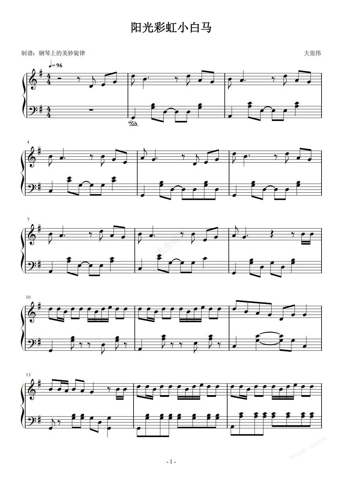 钢琴谱:阳光彩虹小白马 简易版 大张伟
