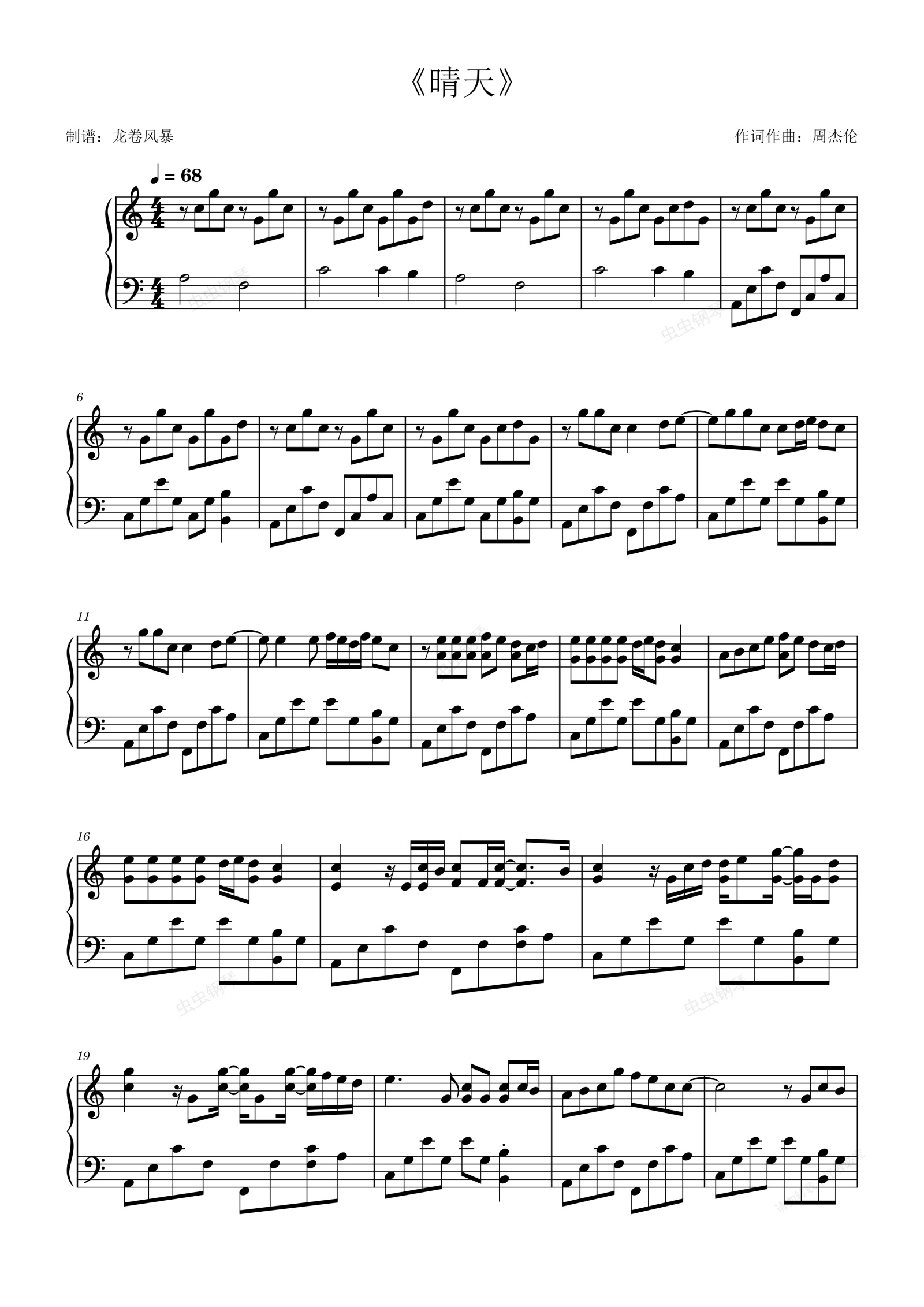 钢琴谱:《晴天》周杰伦(C调简单版)