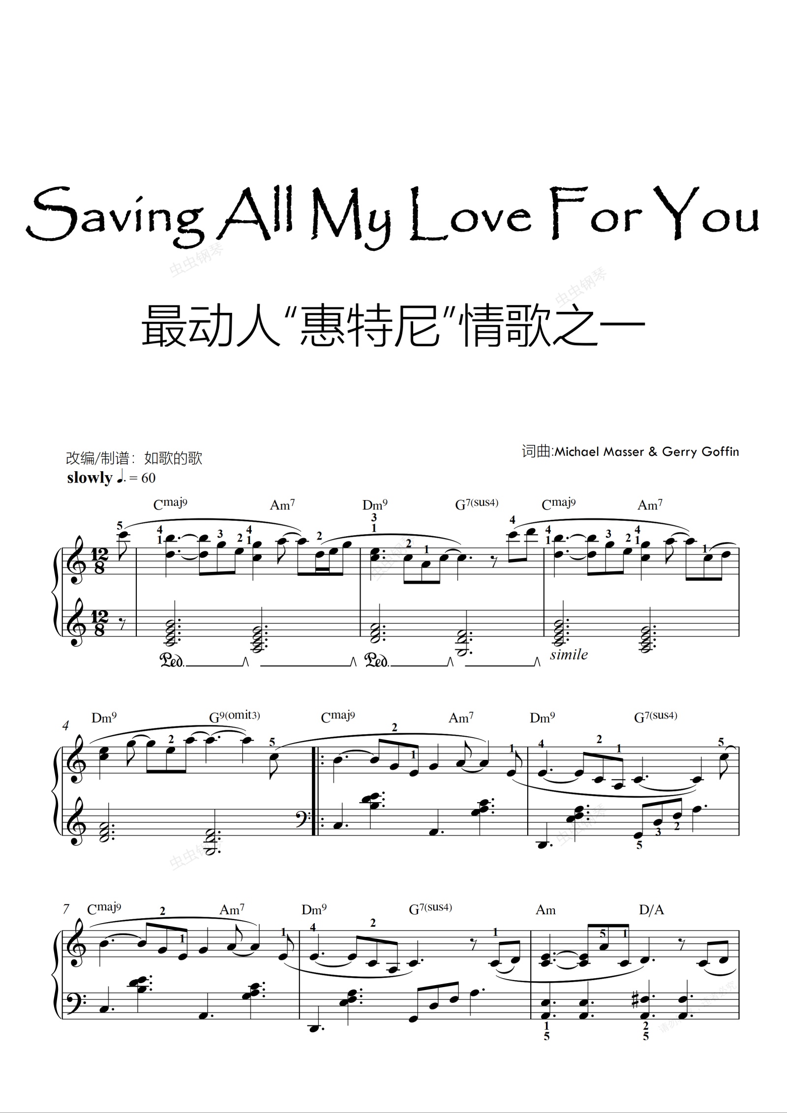 Saving All My Love For You易弹C调惠特尼冠军单曲钢琴独奏(指法&功能)