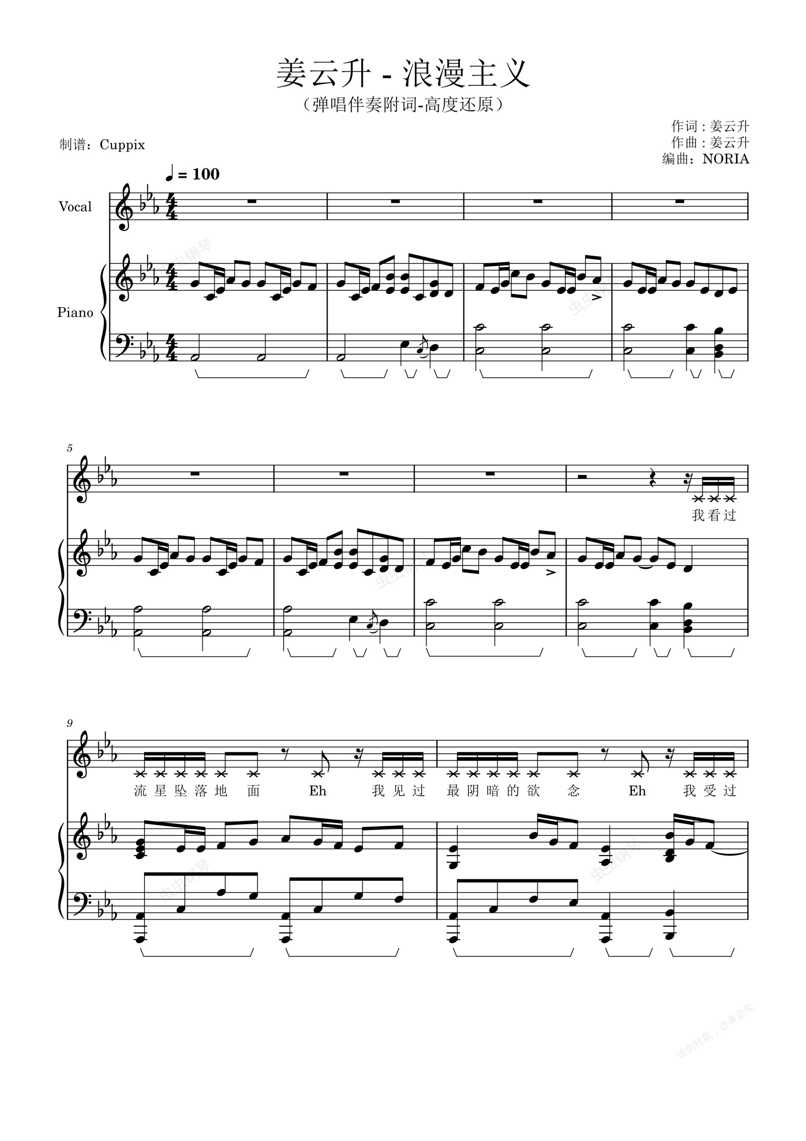 钢琴谱:《浪漫主义》弹唱伴奏附词-高度还原(姜云升)