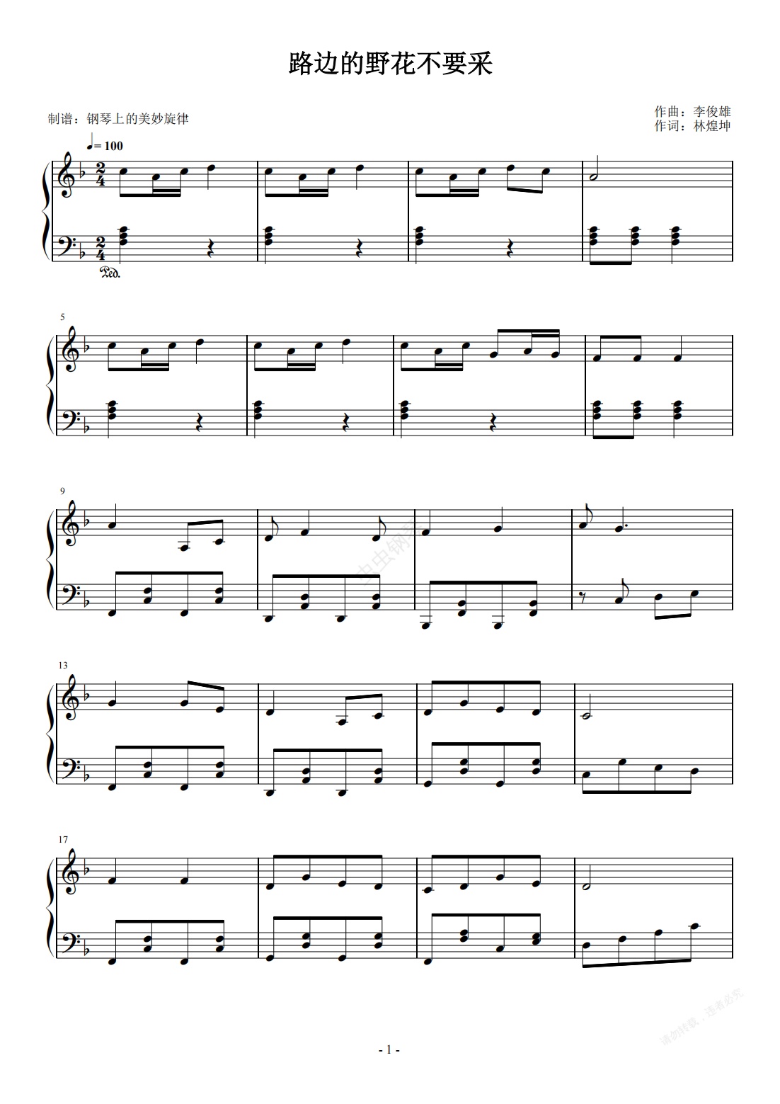 钢琴谱:路边的野花不要采 简易版 邓丽君