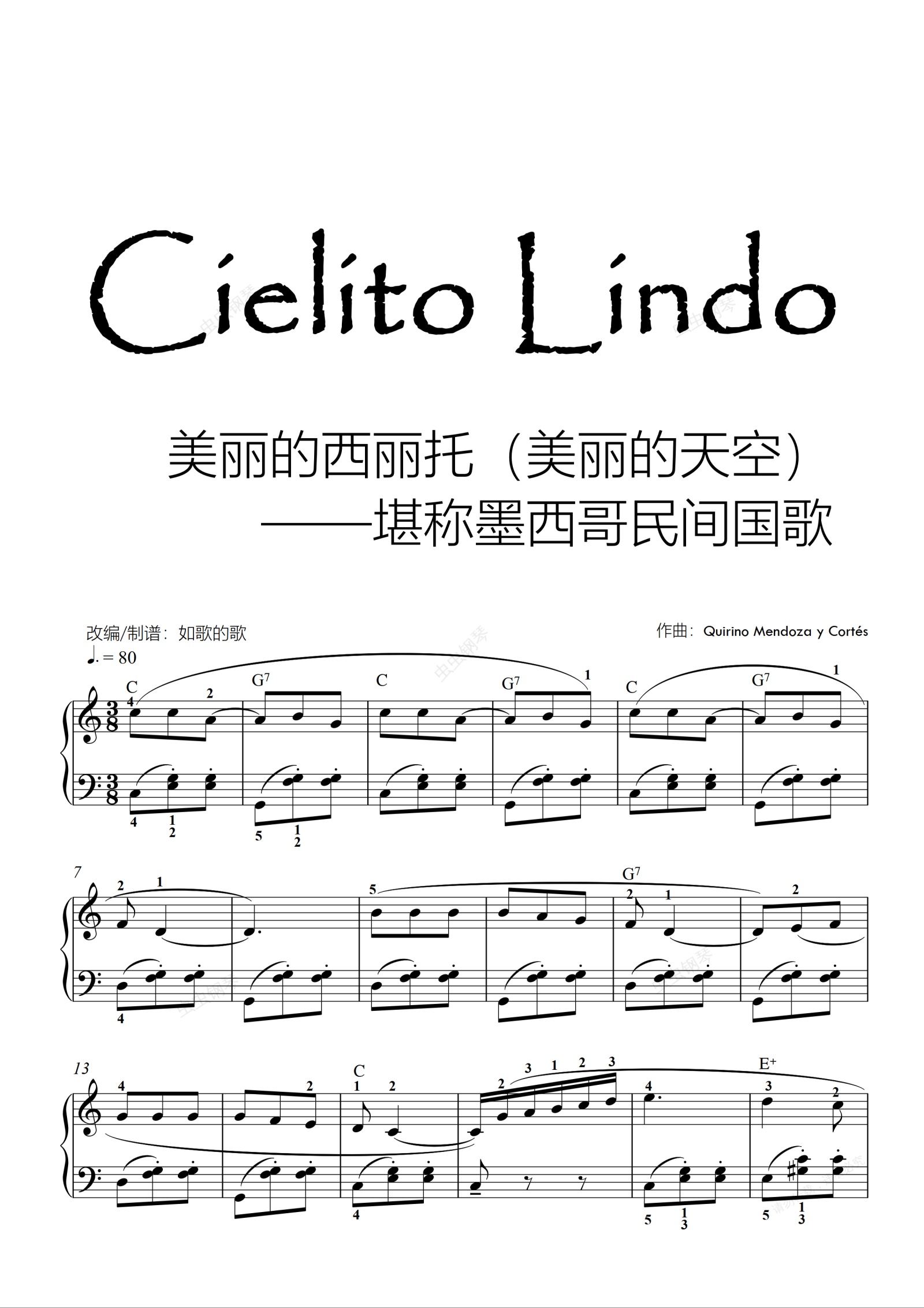 钢琴谱:Cielito Lindo拜厄程度(指法&功能)墨西哥民间国歌好弹好听