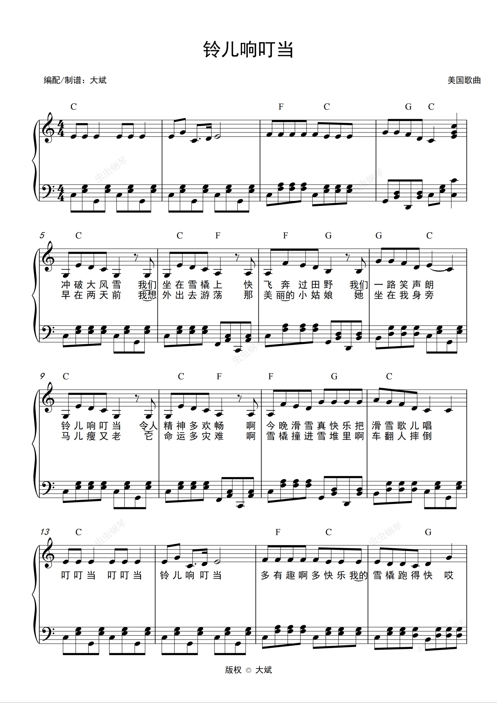 钢琴谱:铃儿响叮当(C调简易)