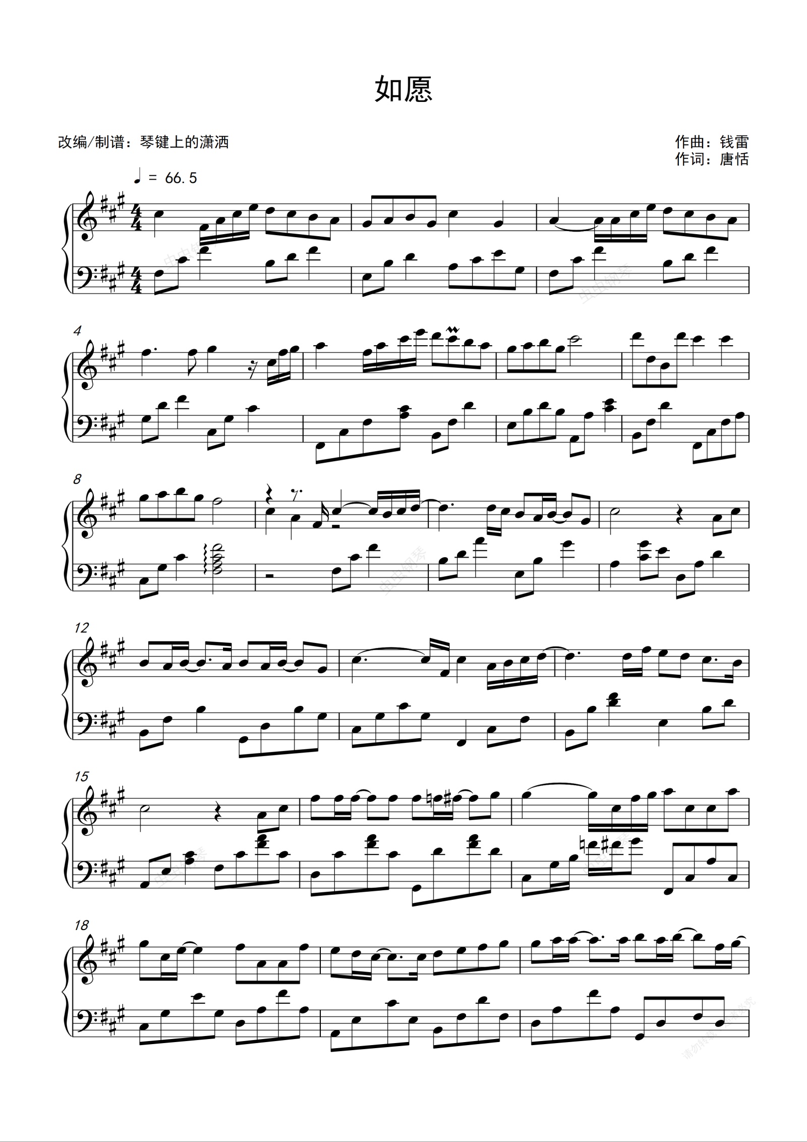 钢琴谱:《如愿》-王菲-完美升f小调独奏