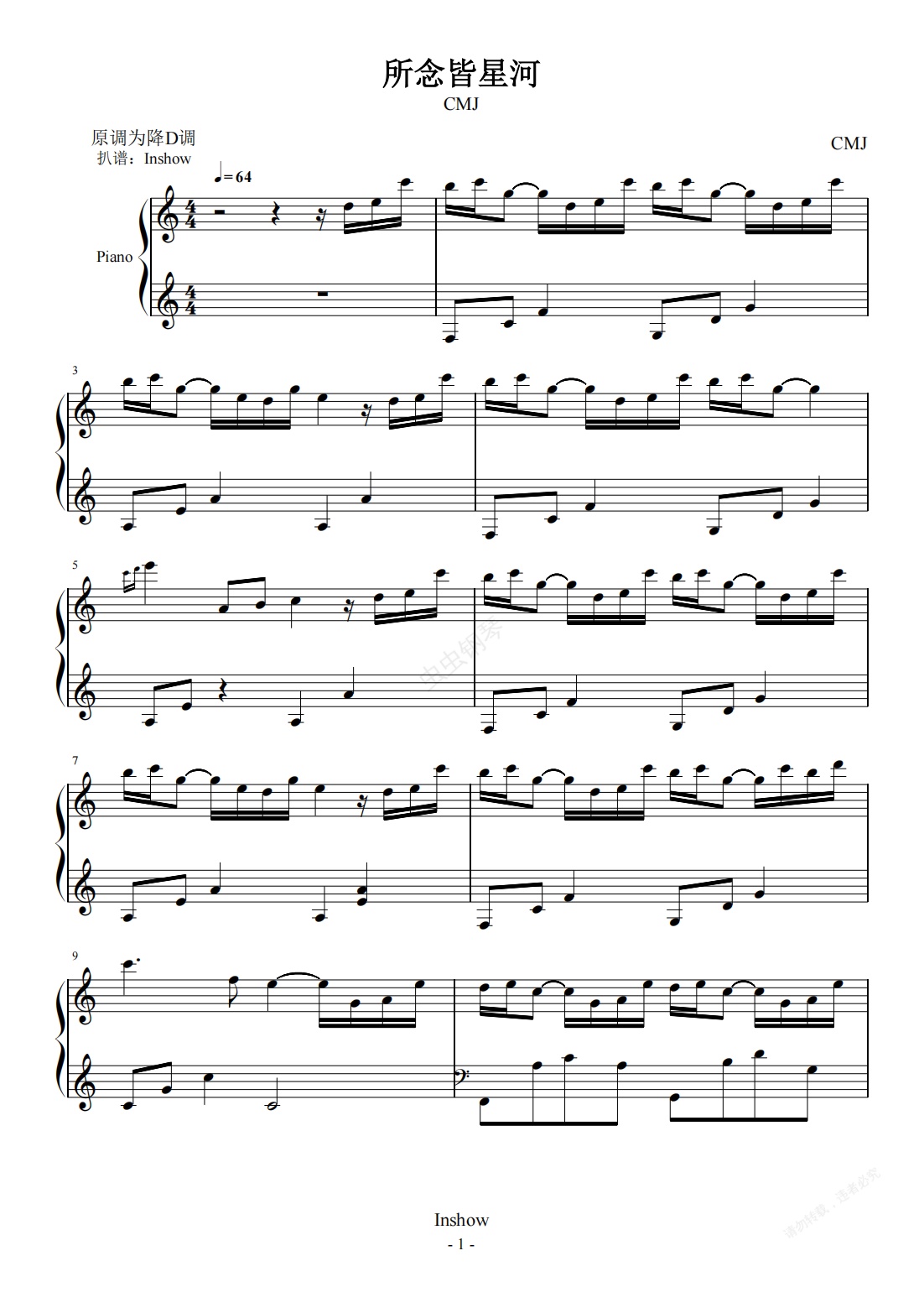 钢琴谱:所念皆星河【C调完整独奏】- CMJ -