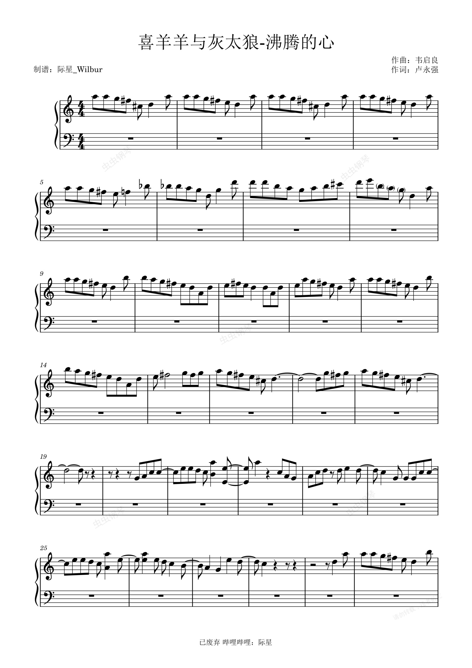 钢琴谱:喜羊羊与灰太狼-沸腾的心 原调钢琴